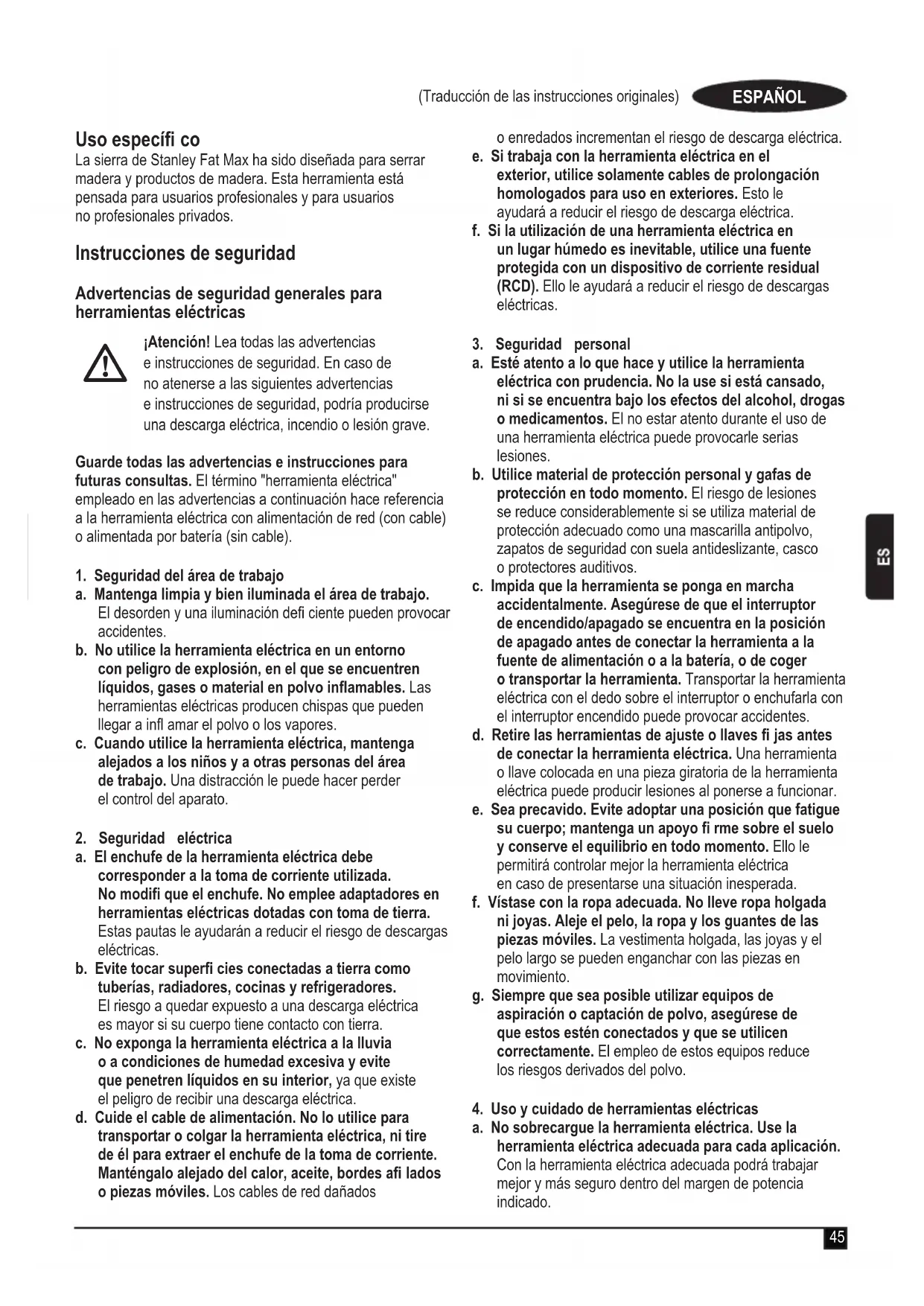 f. Si la utilizacion de una herramienta electrica en un lugar humedo es inevitable, utilise una fuente protegida con un dispositivo de corriente residual (RCD). Illo le ayudara a reducir el risso de descargas electricas.