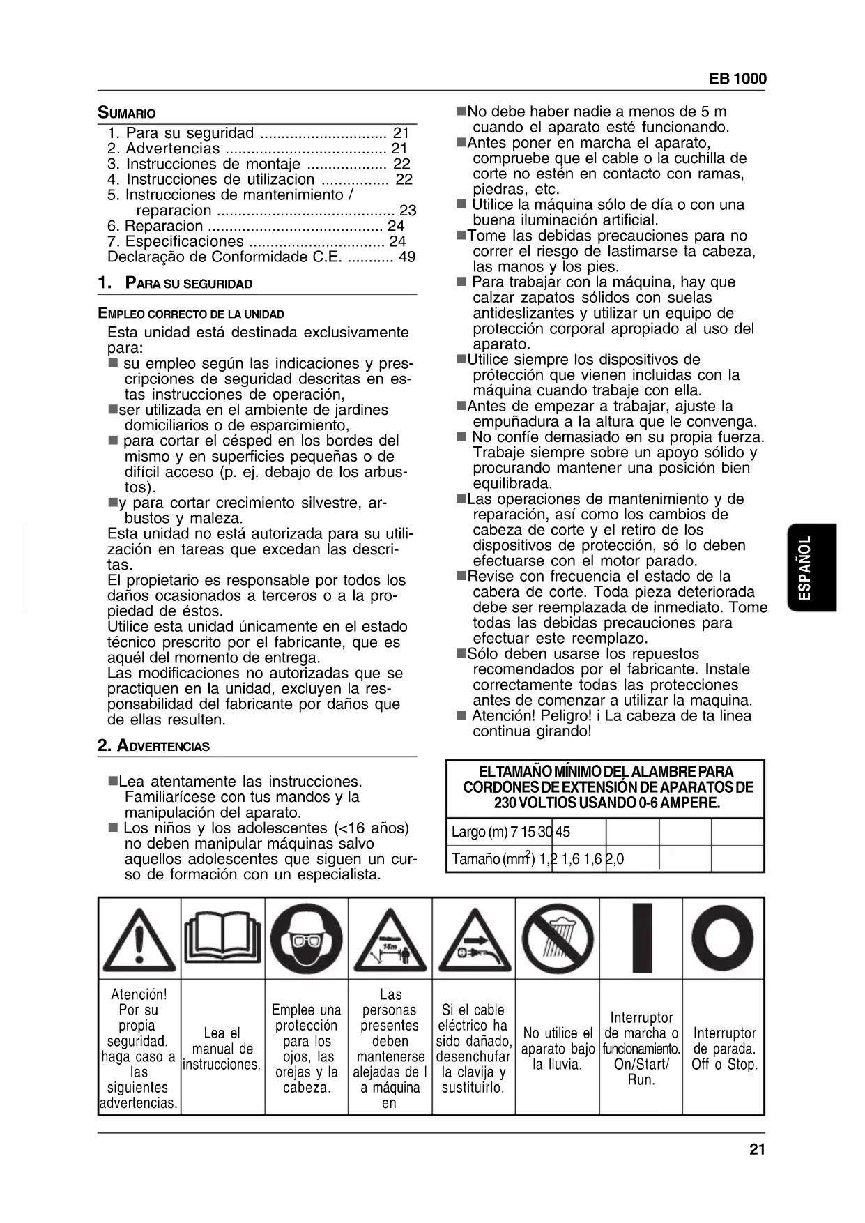 n Lea atentamente las instrucciones. Familiarícese con tus mandos y la manipulación del aparato. n Los niños y los adolescentes (<16 años) no deben manipular máquinas salvo aquellos adolescentes que siguen un cur- so de formación con un especialista. n No debe haber nadie a menos de 5 m cuando el aparato esté funcionando. n Antes poner en marcha el aparato, compruebe que el cable o la cuchilla de corte no estén en contacto con ramas, piedras, etc. n Utilice la máquina sólo de día o con una buena iluminación artificial. n Tome Ias debidas precauciones para no correr el riesgo de Iastimarse ta cabeza, las manos y los pies. n Para trabajar con la máquina, hay que calzar zapatos sólidos con suelas antideslizantes y utilizar un equipo de protección corporal apropiado al uso del aparato. n Utilice siempre los dispositivos de prótección que vienen incluidas con la máquina cuando trabaje con ella. n Antes de empezar a trabajar, ajuste la empuñadura a Ia altura que le convenga. n No confíe demasiado en su propia fuerza. Trabaje siempre sobre un apoyo sólido y procurando mantener una posición bien equilibrada. n Las operaciones de mantenimiento y de reparación, así como los cambios de cabeza de corte y el retiro de los dispositivos de protección, só lo deben efectuarse con el motor parado. n Revise con frecuencia el estado de la cabera de corte. Toda pieza deteriorada debe ser reemplazada de inmediato. Tome todas las debidas precauciones para efectuar este reemplazo. n Sólo deben usarse los repuestos recomendados por el fabricante. Instale correctamente todas las protecciones antes de comenzar a utilizar la maquina. n Atención! Peligro! i La cabeza de ta linea continua girando! EL TAMAÑO MÍNIMO DEL ALAMBRE PARA CORDONES DE EXTENSIÓN DE APARATOS DE 230 VOLTIOS USANDO 0-6 AMPERE. Tamaño (mm