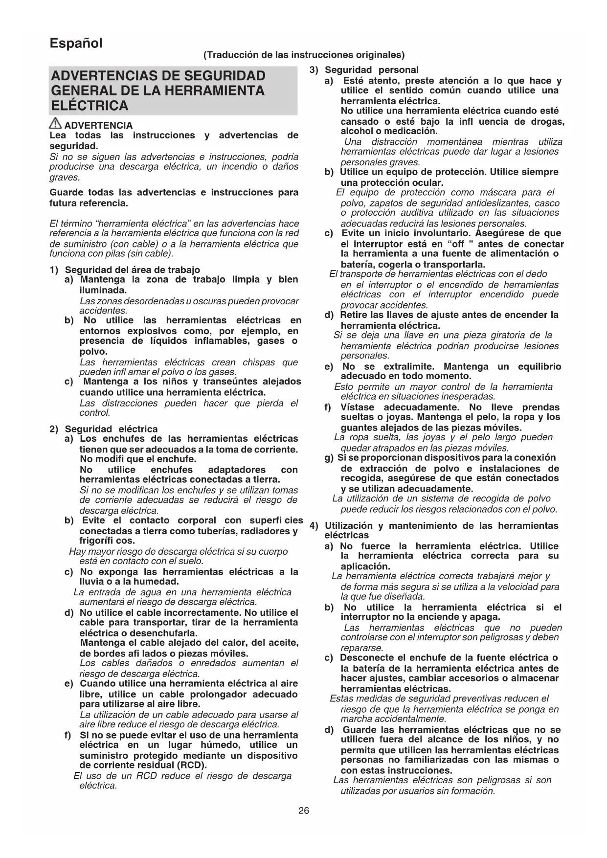 ELÉCTRICA ADVERTENCIA Lea todas las instrucciones y advertencias de seguridad. Si no se siguen las advertencias e instrucciones, podría producirse una descarga eléctrica, un incendio o daños graves. Guarde todas las advertencias e instrucciones para futura referencia. El término “herramienta eléctrica” en las advertencias hace referencia a la herramienta eléctrica que funciona con la red de suministro (con cable) o a la herramienta eléctrica que funciona con pilas (sin cable).