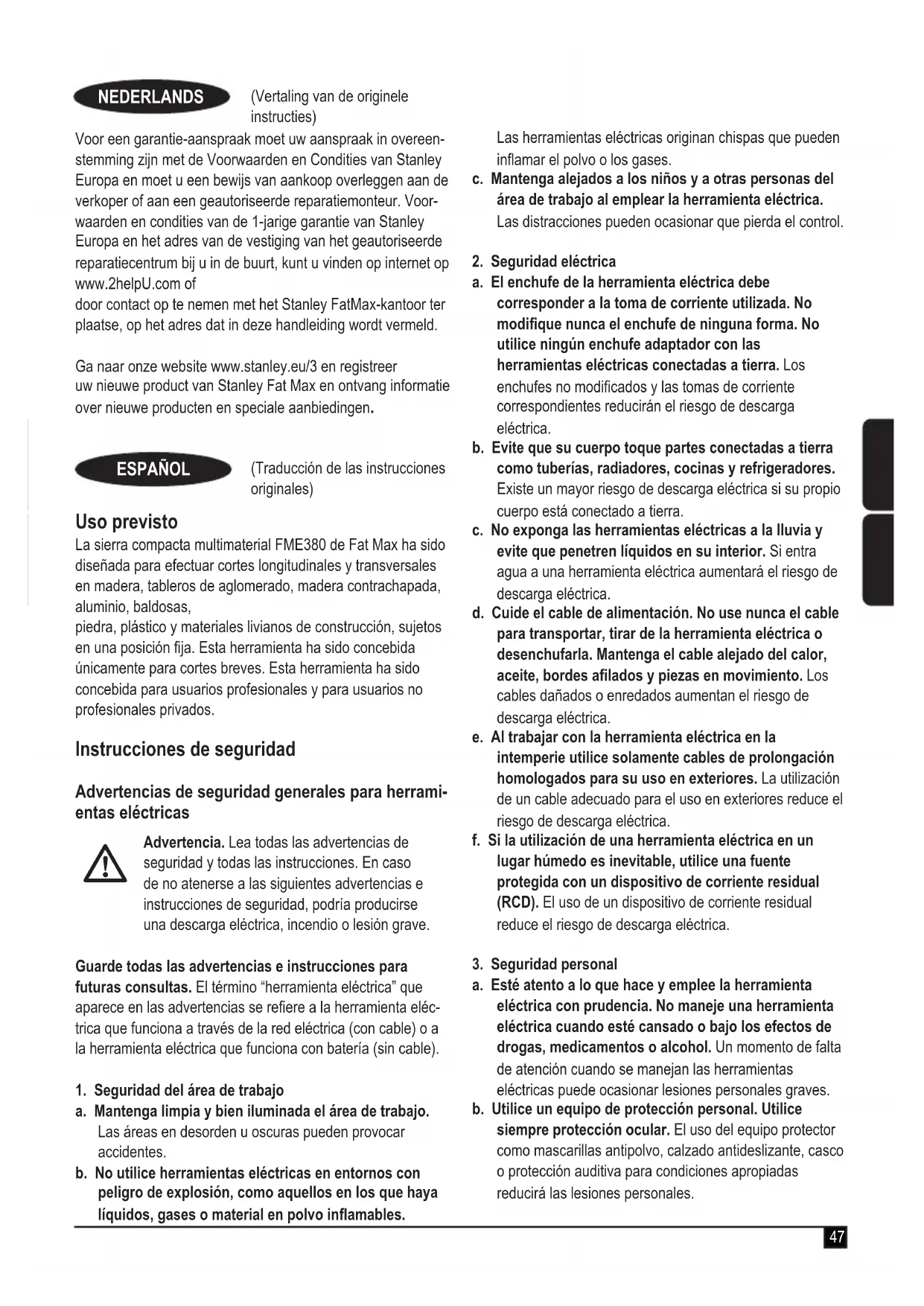 Para reclamar la garantía, la reclamación deben estar de conformidad con las conditiones de Stanley Europeydeferá adjuntar un justificante de compral vendedor o al agente的技术ico autorizzato. Las conditiones de la garantía de 1 ano de Stanley Europe y laubicacion de su agente的技术ico autorizzato mas cercano se pueda Obtener en Internet en www.2helpU. com o poniendose en contacto con su oficina local de Stanley FatMax en la direccion que se indica en este manual.