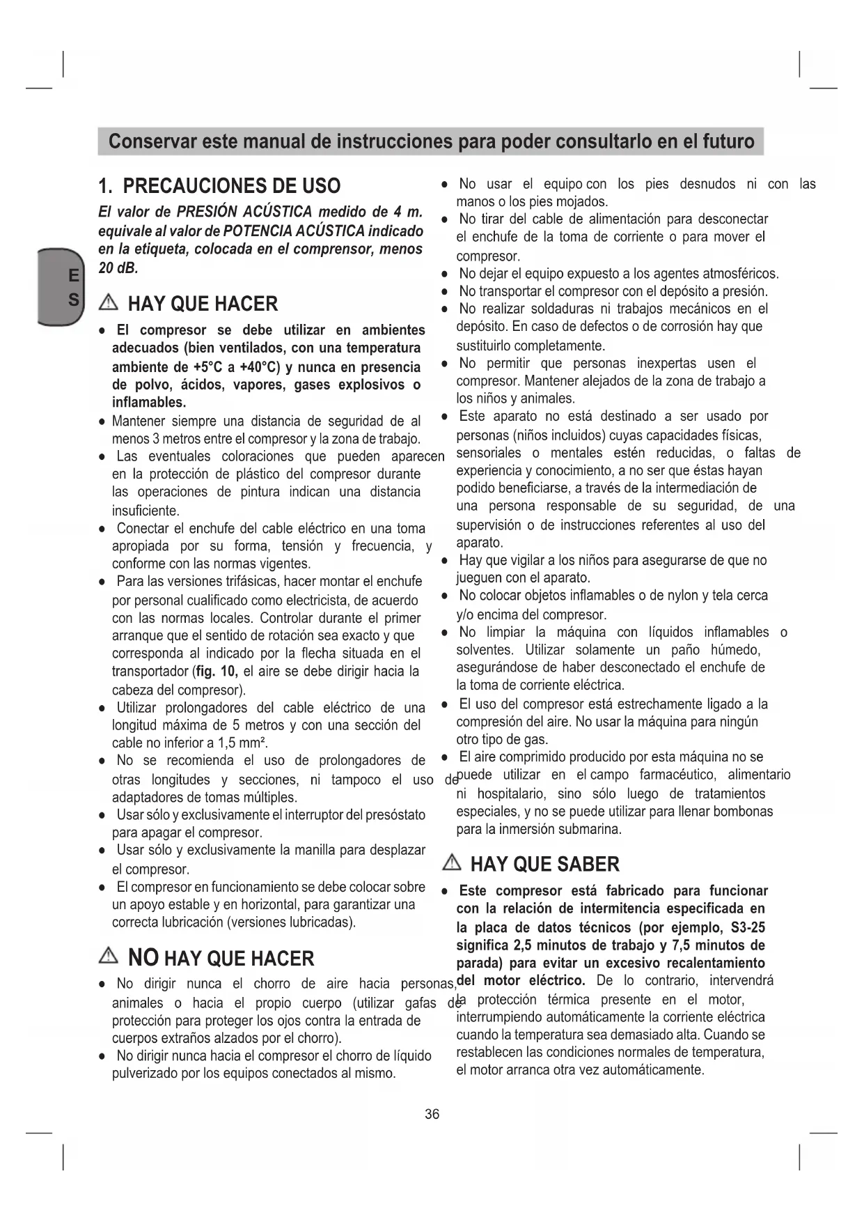 - El compresor es apto para su uso en recintos secs. No se permitse su uso en areas de trabajo donde se produzcan salpicaduras.