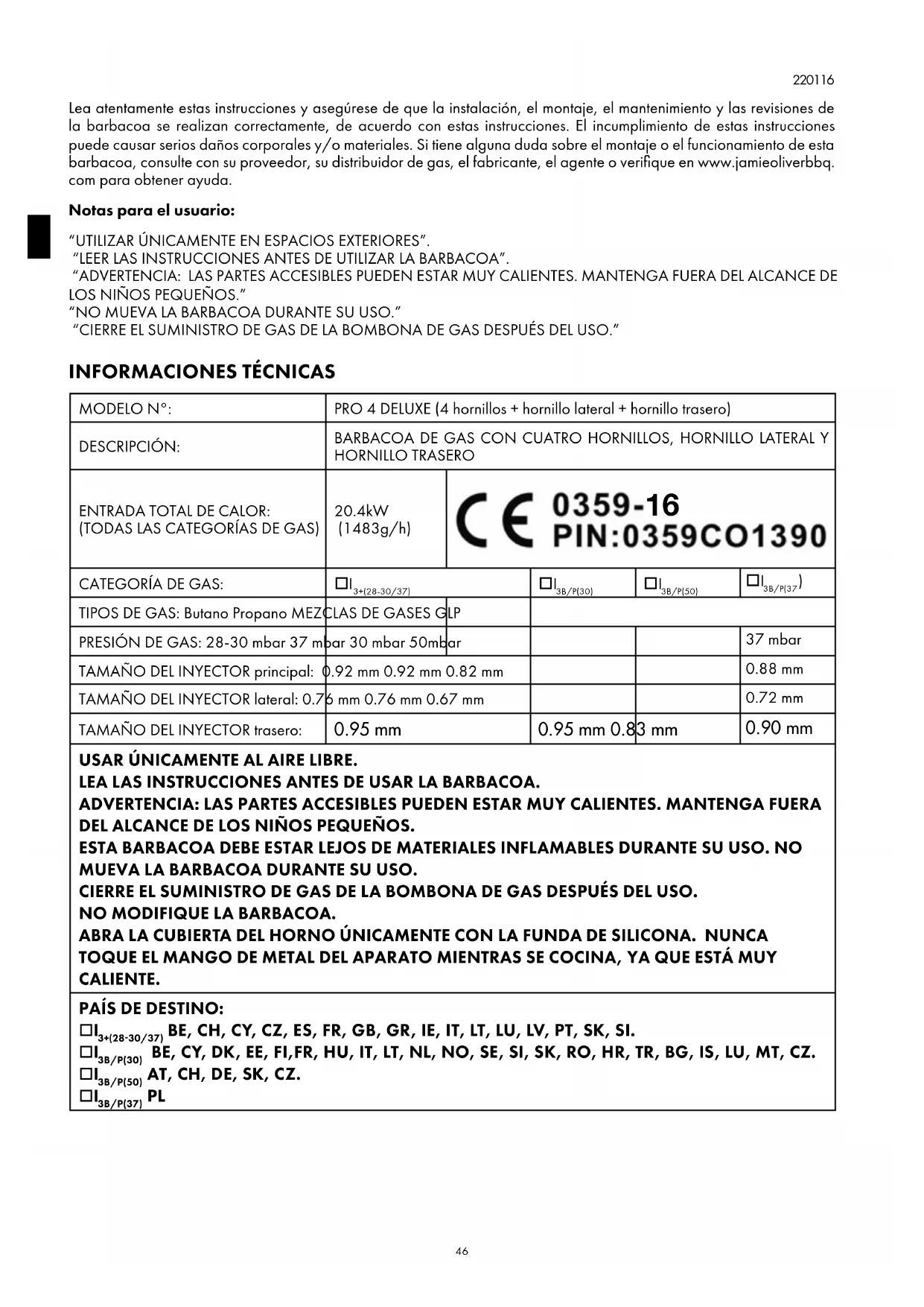 Lea atentamente estas instrucciones y asegúrese de que la instalación, el montaje, el mantenimiento y las revisiones de la barbacoa se realizan correctamente, de acuerdo con estas instrucciones. El incumplimiento de estas instrucciones puede causar serios daños corporales y/o materiales. Si tiene alguna duda sobre el montaje o el funcionamiento de esta barbacoa, consulte con su proveedor, su distribuidor de gas, el fabricante, el agente o verifique en www.jamieoliverbbq. com para obtener ayuda. Notas para el usuario: “UTILIZAR ÚNICAMENTE EN ESPACIOS EXTERIORES”. “LEER LAS INSTRUCCIONES ANTES DE UTILIZAR LA BARBACOA”. “ADVERTENCIA: LAS PARTES ACCESIBLES PUEDEN ESTAR MUY CALIENTES. MANTENGA FUERA DEL ALCANCE DE