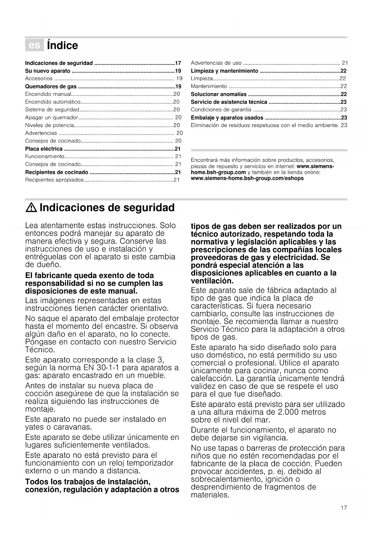 - Embalaje y aparatos usados Eliminación de residuos respetuosa con el medio ambiente. 23 Produktinfo Encontrará más información sobre productos, accesorios, piezas de repuesto y servicios en internet: www.siemens- home.bsh-group.com y también en la tienda online: www.siemens-home.bsh-group.com/eshops : Indicaciones de seguridad Lea atentamente estas instrucciones. Solo entonces podrá manejar su aparato de manera efectiva y segura. Conserve las instrucciones de uso e instalación y entréguelas con el aparato si este cambia de dueño. El fabricante queda exento de toda responsabilidad si no se cumplen las disposiciones de este manual. Las imágenes representadas en estas instrucciones tienen carácter orientativo. No saque el aparato del embalaje protector hasta el momento del encastre. Si observa algún daño en el aparato, no lo conecte. Póngase en contacto con nuestro Servicio Técnico. Este aparato corresponde a la clase 3, según la norma EN 30-1-1 para aparatos a gas: aparato encastrado en un mueble. Antes de instalar su nueva placa de cocción asegúrese de que la instalación se realiza siguiendo las instrucciones de montaje. Este aparato no puede ser instalado en yates o caravanas. Este aparato se debe utilizar únicamente en lugares suficientemente ventilados. Este aparato no está previsto para el funcionamiento con un reloj temporizador externo o un mando a distancia. Todos los trabajos de instalación, conexión, regulación y adaptación a otros tipos de gas deben ser realizados por un técnico autorizado, respetando toda la normativa y legislación aplicables y las prescripciones de las compañías locales proveedoras de gas y electricidad. Se pondrá especial atención a las disposiciones aplicables en cuanto a la ventilación. Este aparato sale de fábrica adaptado al tipo de gas que indica la placa de características. Si fuera necesario cambiarlo, consulte las instrucciones de montaje. Se recomienda llamar a nuestro Servicio Técnico para la adaptación a otros tipos de gas. Este aparato ha sido diseñado solo para uso doméstico, no está permitido su uso comercial o profesional. Utilice el aparato únicamente para cocinar, nunca como calefacción. La garantía únicamente tendrá validez en caso de que se respete el uso para el que fue diseñado. Este aparato está previsto para ser utilizado a una altura máxima de 2.000 metros sobre el nivel del mar. Durante el funcionamiento, el aparato no debe dejarse sin vigilancia. No use tapas o barreras de protección para niños que no estén recomendadas por el fabricante de la placa de cocción. Pueden provocar accidentes, p. ej. debido al sobrecalentamiento, ignición o desprendimiento de fragmentos de materiales.18 Este aparato puede ser utilizado por niños a partir de 8 años y por personas con limitaciones físicas, sensoriales o psíquicas, o que carezcan de experiencia y conocimientos, siempre y cuando sea bajo la supervisión de una persona responsable de su seguridad o que le haya instruido en el uso correcto del aparato siendo consciente de los daños que se pudieran ocasionar. No dejar que los niños jueguen con el aparato. La limpieza y el mantenimiento rutinario no deben encomendarse a los niños a menos que sean mayores de 15 años y lo hagan bajo supervisión. Mantener a los niños menores de 8 años alejados del aparato y del cable de conexión. ¡Peligro de deflagración! La acumulación de gas sin quemar en un recinto cerrado conlleva peligro de deflagración. No someta el aparato a corrientes de aire. Los quemadores podrían apagarse. Lea atentamente las instrucciones y advertencias relativas al funcionamiento de los quemadores de gas. ¡Peligro de intoxicación! El uso de un aparato de cocción a gas produce calor, humedad y productos de combustión en el local donde está instalado. Asegure una buena ventilación de la cocina, especialmente mientras la placa de cocción esté en funcionamiento: mantenga abiertos los orificios de ventilación natural o instale un dispositivo de ventilación mecánica (campana extractora). La utilización intensa y prolongada del aparato puede necesitar una ventilación complementaria o más eficaz: abra una ventana o aumente la potencia de la ventilación mecánica. ¡Peligro de quemaduras! p. 23