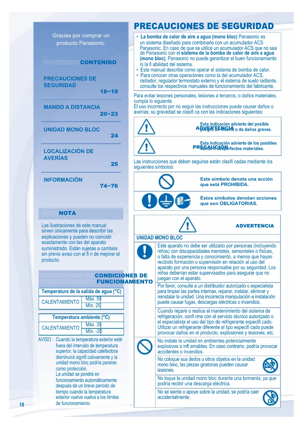FUNCIONAMIENTOFUNCIONAMIENTO Temperatura de la salida de agua (°C) CALENTAMIENTO Máx. 55 Mín. 25 Temperatura ambiente (°C) CALENTAMIENTO Máx. 35 Mín. -20 AVISO : Cuando la temperatura exterior esté fuera del intervalo de temperatura superior, la capacidad calefactora disminuirá signifi cativamente y la unidad mono bloc podría pararse como protección. La unidad se pondrá en funcionamiento automáticamente después de un breve periodo de tiempo cuando la temperatura exterior vuelve vuelva a los límites de funcionamiento. Para evitar lesiones personales, lesiones a terceros, o daños materiales, cumpla lo siguiente. El uso incorrecto por no seguir las instrucciones puede causar daños o averías; su gravedad se clasifi ca con las indicaciones siguientes: ADVERTENCIAADVERTENCIA Esta indicación advierte del posible peligro de muerte o de daños graves.