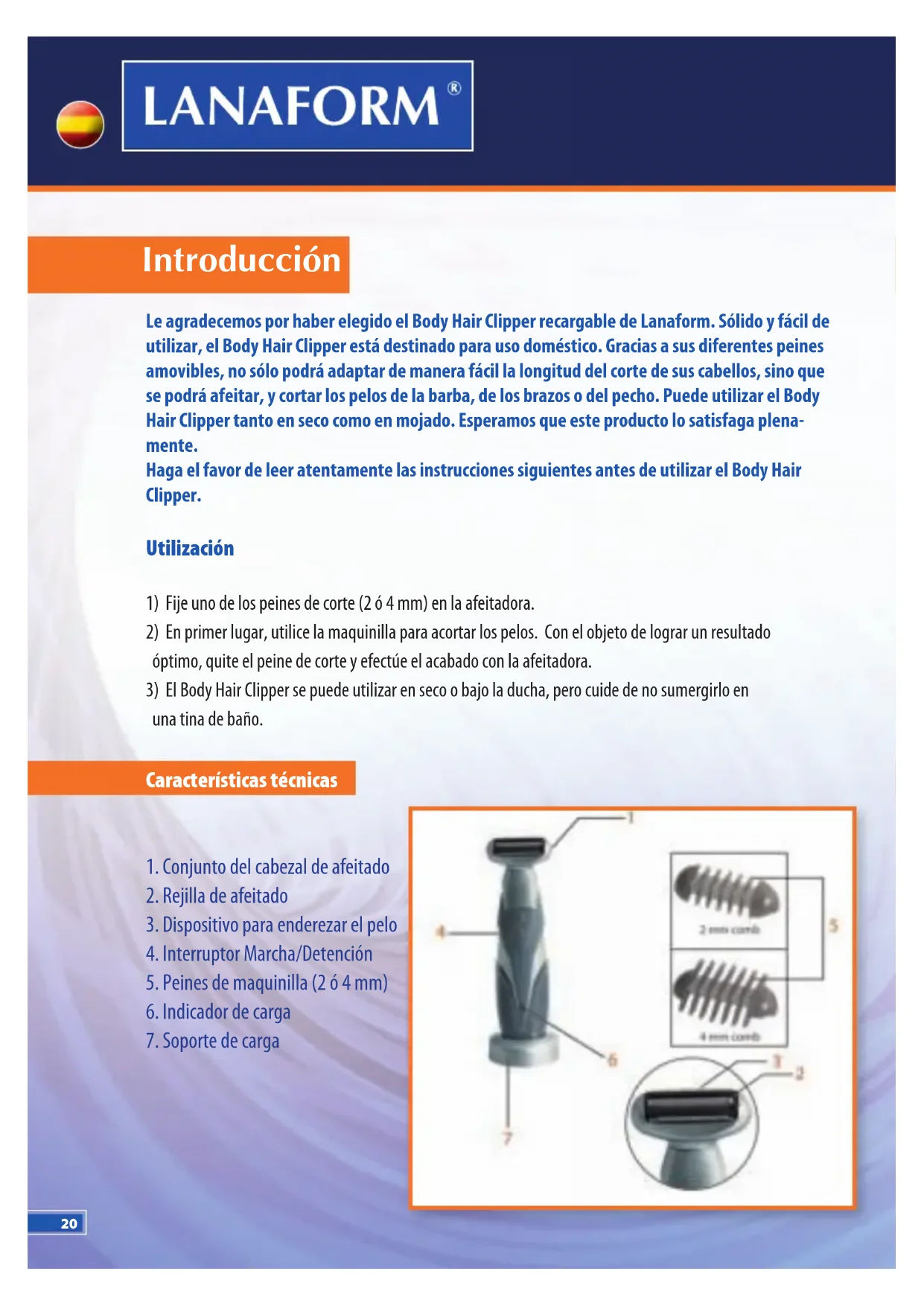 LANAFORM® garantiza que este producto no tiene ningún defecto de material ni de fabricación durante un período de dos años, a partir de la fecha de la compra, con excepción de las precisiones que se indican a continuación. La garantía sobre este producto LANAFORM® no cubre los daños provocados como consecuencia de cualquier utilización abusiva o incorrecta, de un accidente, del montaje de un accesorio no autorizado, de una modi cación del producto o de cualquier otra condición, de cualquier naturaleza que ella sea, que escape al control de LANAFORM®. LANAFORM® no podrá ser considerado responsable de cualquier tipo de daño accesorio, consecutivo o especial. Todas las garantías implícitas de aptitud del producto se limitan a un período de dos años, a contar desde la fecha de compra inicial. A partir de la recepción, LANAFORM® reparará o reemplazará, según venga al caso, su afeitadora-maquinilla personal y se la devolverá tomando a cargo todos los gastos. La garantía solamente se hace efectiva a través de la mediación del Centre Service de LANAFORM®. Cualquier actividad de mantenimiento de este producto que se confíe a cualquier entidad diferente del Centro de Servicio de LANAFORM® anulará la presente garantía.24 Introduzione La ringraziamo di aver acquistato il Body Hair Clipper ricaricabile di Lanaform. Robusto e di facile utilizzo, il Body Hair Clipper è destinato ad un uso domestico. Grazie ai suoi diversi pettini amovibili, è possibile adeguare facilmente la lunghezza di taglio dei capelli, ma anche radersi, tagliare i peli della barba, delle ascelle o del petto. Si può utilizzare il Body Hair Clipper a secco o ad umido. Ci auguriamo che questo prodotto la soddis pienamente. Legga attentamente il presente manuale prima di utilizzare il prodotto. Utilizzo