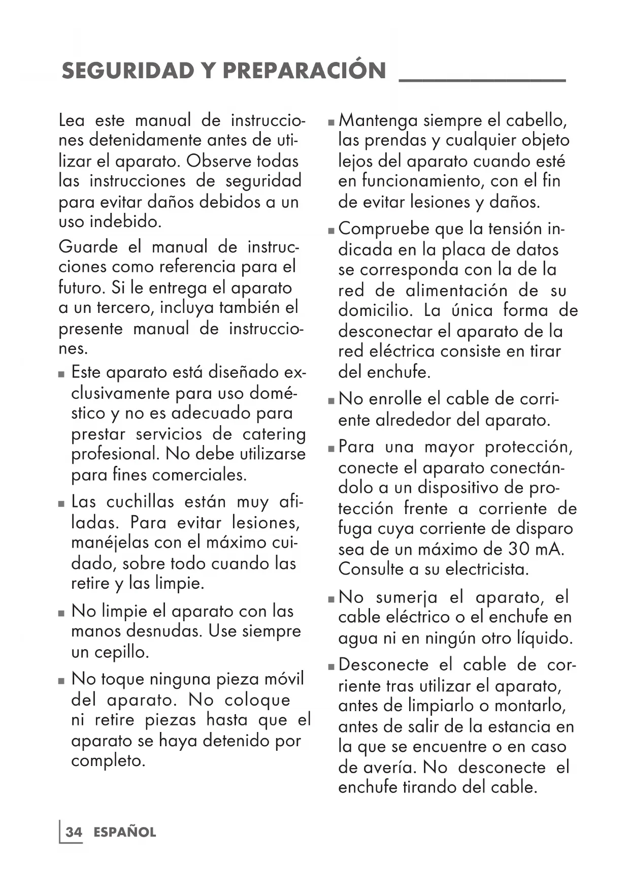 Desconecte el cable de cor- riente tras utilizar el aparato, antes de limpiarlo o montarlo, antes de salir de la estancia en la que se encuentre o en caso de avería. No desconecte el enchufe tirando del cable.35 ESPAÑOL