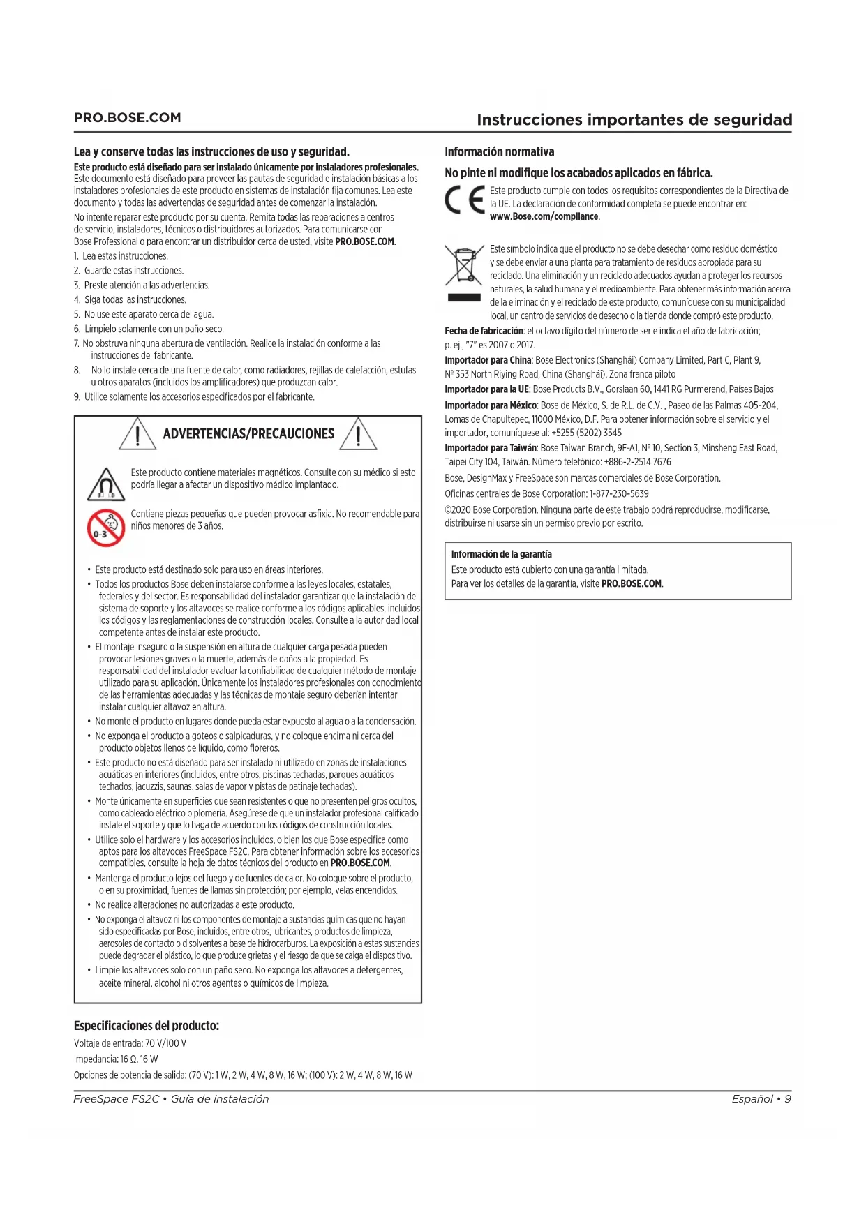 Información normativa No pinte ni modifique los acabados aplicados en fábrica. Este producto cumple con todos los requisitos correspondientes de la Directiva de la UE. La declaración de conformidad completa se puede encontrar en: www.Bose.com/compliance. Este símbolo indica que el producto no se debe desechar como residuo doméstico yse debe enviar a una planta para tratamiento de residuos apropiada para su reciclado. Una eliminación y un reciclado adecuados ayudan a proteger los recursos naturales, lasalud humana y el medioambiente. Para obtener más información acerca de la eliminación y el reciclado de este producto, comuníquese con su municipalidad local, un centro de servicios de desecho o la tienda donde compró este producto. Fecha de fabricación: el octavo dígito del número de serie indica el año de fabricación; p.ej., "7" es 2007 o 2017. Importador para China: Bose Electronics (Shanghái) Company Limited, Part C, Plant 9, Nº 353 North Riying Road, China (Shanghái), Zona franca piloto Importador para la UE: Bose Products B.V., Gorslaan 60, 1441 RG Purmerend, Países Bajos Importador para México: Bose de México, S. de R.L. de C.V. , Paseo de las Palmas 405-204, Lomas de Chapultepec, 11000 México, D.F. Para obtener información sobre el servicio y el importador, comuníquese al: +5255 (5202) 3545 Importador para Taiwán: Bose Taiwan Branch, 9F-A1, Nº 10, Section 3, Minsheng East Road, Taipei City 104, Taiwán. Número telefónico: +886-2-2514 7676 Bose, DesignMax y FreeSpace son marcas comerciales de Bose Corporation. Oficinas centrales de Bose Corporation: 1-877-230-5639 ©2020 Bose Corporation. Ninguna parte de este trabajo podrá reproducirse, modificarse, distribuirse ni usarse sin un permiso previo por escrito. Información de la garantía Este producto está cubierto con una garantía limitada. Para ver los detalles de la garantía, visite PRO.BOSE.COM. Especificaciones del producto: Voltaje de entrada: 70 V/100 V Impedancia: 16 Ω, 16 W Opciones de potencia de salida: (70 V): 1 W, 2 W, 4 W, 8 W, 16 W; (100 V): 2 W, 4 W, 8 W, 16 W ADVERTENCIAS/PRECAUCIONES Este producto contiene materiales magnéticos. Consulte con su médico si esto podría llegar a afectar un dispositivo médico implantado. Contiene piezas pequeñas que pueden provocar asfixia. No recomendable para niños menores de 3 años.