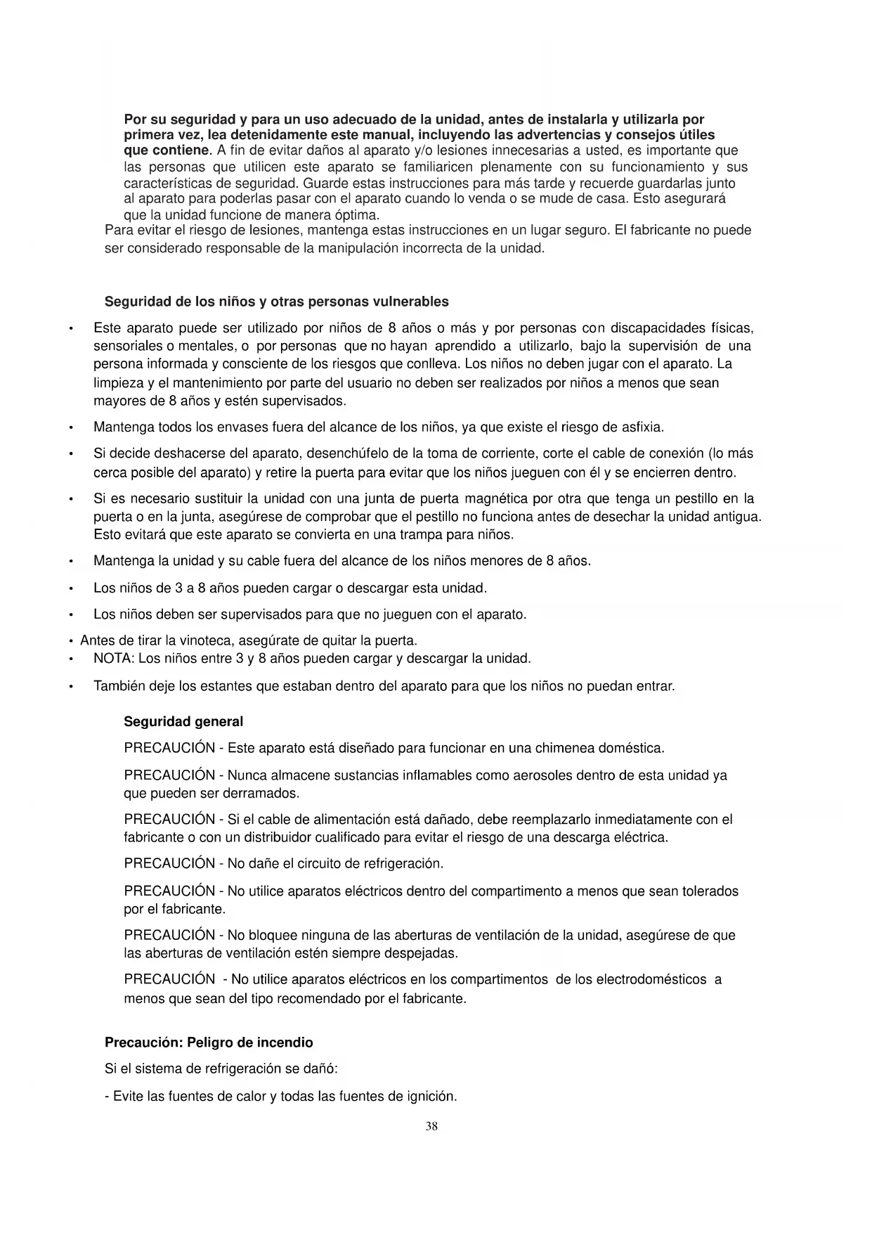 - También deje los estantes que estaban dentro del aparato para que los niños no puedan entrar. Seguridad general PRECAUCIÓN - Este aparato está diseñado para funcionar en una chimenea doméstica. PRECAUCIÓN - Nunca almacene sustancias inflamables como aerosoles dentro de esta unidad ya que pueden ser derramados. PRECAUCIÓN - Si el cable de alimentación está dañado, debe reemplazarlo inmediatamente con el fabricante o con un distribuidor cualificado para evitar el riesgo de una descarga eléctrica. PRECAUCIÓN - No dañe el circuito de refrigeración. PRECAUCIÓN - No utilice aparatos eléctricos dentro del compartimento a menos que sean tolerados por el fabricante. PRECAUCIÓN - No bloquee ninguna de las aberturas de ventilación de la unidad, asegúrese de que las aberturas de ventilación estén siempre despejadas. PRECAUCIÓN - No utilice aparatos eléctricos en los compartimentos de los electrodomésticos a menos que sean del tipo recomendado por el fabricante. Precaución: Peligro de incendio Si el sistema de refrigeración se dañó: - Evite las fuentes de calor y todas las fuentes de ignición.39 - Ventile la habitación donde se encuentra la unidad. Es peligroso cambiar la composición de este dispositivo de cualquier manera. Un daño en el cable puede causar un cortocircuito y/o una descarga eléctrica. Seguridad eléctrica