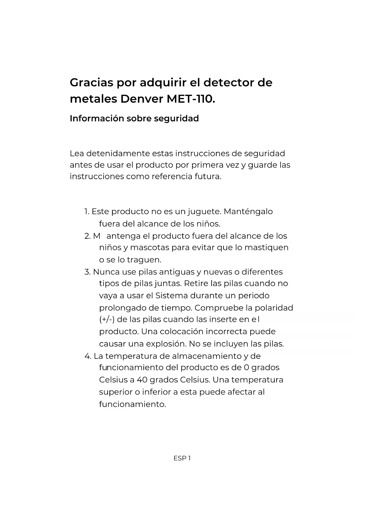enver A/S Omega 5A, Soeften DK-8382 Hinnerup Danemark www.facebook.com/denver.euESP 1 Gracias por adquirir el detector de metales Denver MET-110. Información sobre seguridad Lea detenidamente estas instrucciones de seguridad antes de usar el producto por primera vez y guarde las instrucciones como referencia futura.