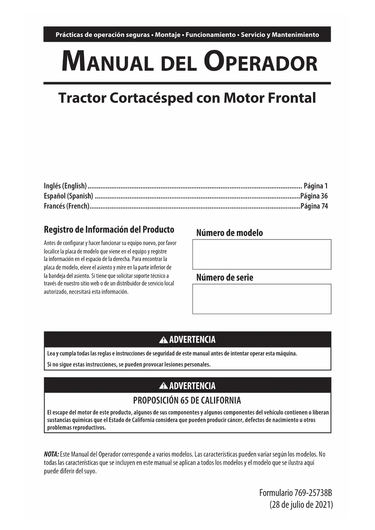 NOTA: Este Manual del Operador corresponde a varios modelos. Las características pueden variar según los modelos. No todas las características que se incluyen en este manual se aplican a todos los modelos y el modelo que se ilustra aquí puede diferir del suyo.
