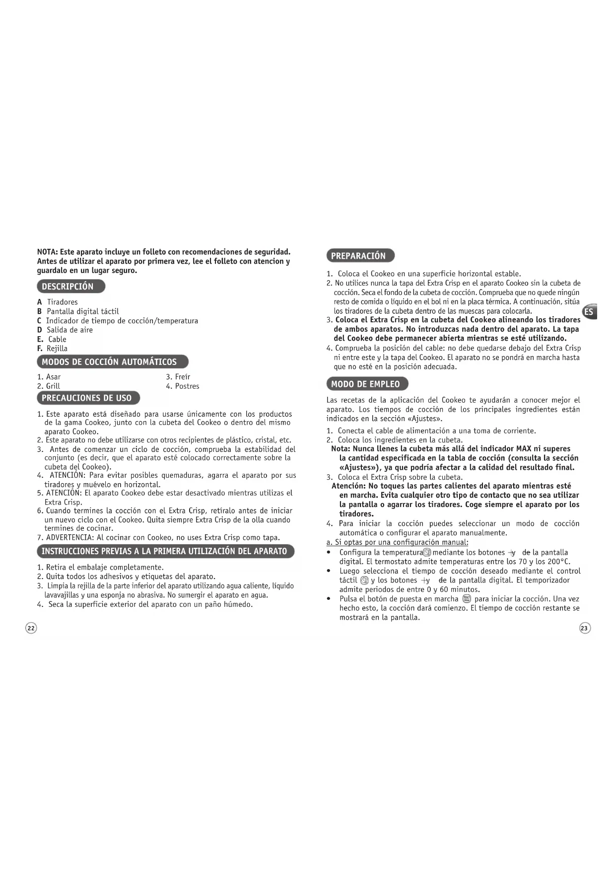 1 Este aparato está diseñado para usarse únicamente con los productos de la gama Cookeo, junto con la cubeta del Cookeo o dentro del mismo aparato Cookeo 2 Este aparato no debe utilizarse con otros recipientes de plástico, cristal, etc 3 Antes de comenzar un ciclo de cocción, comprueba la estabilidad del conjunto (es decir, que el aparato esté colocado correctamente sobre la cubeta del Cookeo) 4 ATENCIÓN: Para evitar posibles quemaduras, agarra el aparato por sus tiradores y muévelo en horizontal 5 ATENCIÓN: El aparato Cookeo debe estar desactivado mientras utilizas el Extra Crisp 6 Cuando termines la cocción con el Extra Crisp, retíralo antes de iniciar un nuevo ciclo con el Cookeo Quita siempre Extra Crisp de la olla cuando termines de cocinar 7 ADVERTENCIA: Al cocinar con Cookeo, no uses Extra Crisp como tapa INSTRUCCIONES PREVIAS A LA PRIMERA UTILIZACIÓN DEL APARATO 1 Retira el embalaje completamente 2 Quita todos los adhesivos y etiquetas del aparato 3 Limpia la rejilla de la parte inferior del aparato utilizando agua caliente, líquido lavavajillas y una esponja no abrasiva No sumergir el aparato en agua 4 Seca la superficie exterior del aparato con un paño húmedo PREPARACIÓN 1 Coloca el Cookeo en una superficie horizontal estable 2 No utilices nunca la tapa del Extra Crisp en el aparato Cookeo sin la cubeta de cocción Seca el fondo de la cubeta de cocción Comprueba que no quede ningún resto de comida o líquido en el bol ni en la placa térmica A continuación, sitúa los tiradores de la cubeta dentro de las muescas para colocarla 3 Coloca el Extra Crisp en la cubeta del Cookeo alineando los tiradores de ambos aparatos. No introduzcas nada dentro del aparato. La tapa del Cookeo debe permanecer abierta mientras se esté utilizando. 4 Comprueba la posición del cable: no debe quedarse debajo del Extra Crisp ni entre este y la tapa del Cookeo El aparato no se pondrá en marcha hasta que no esté en la posición adecuada