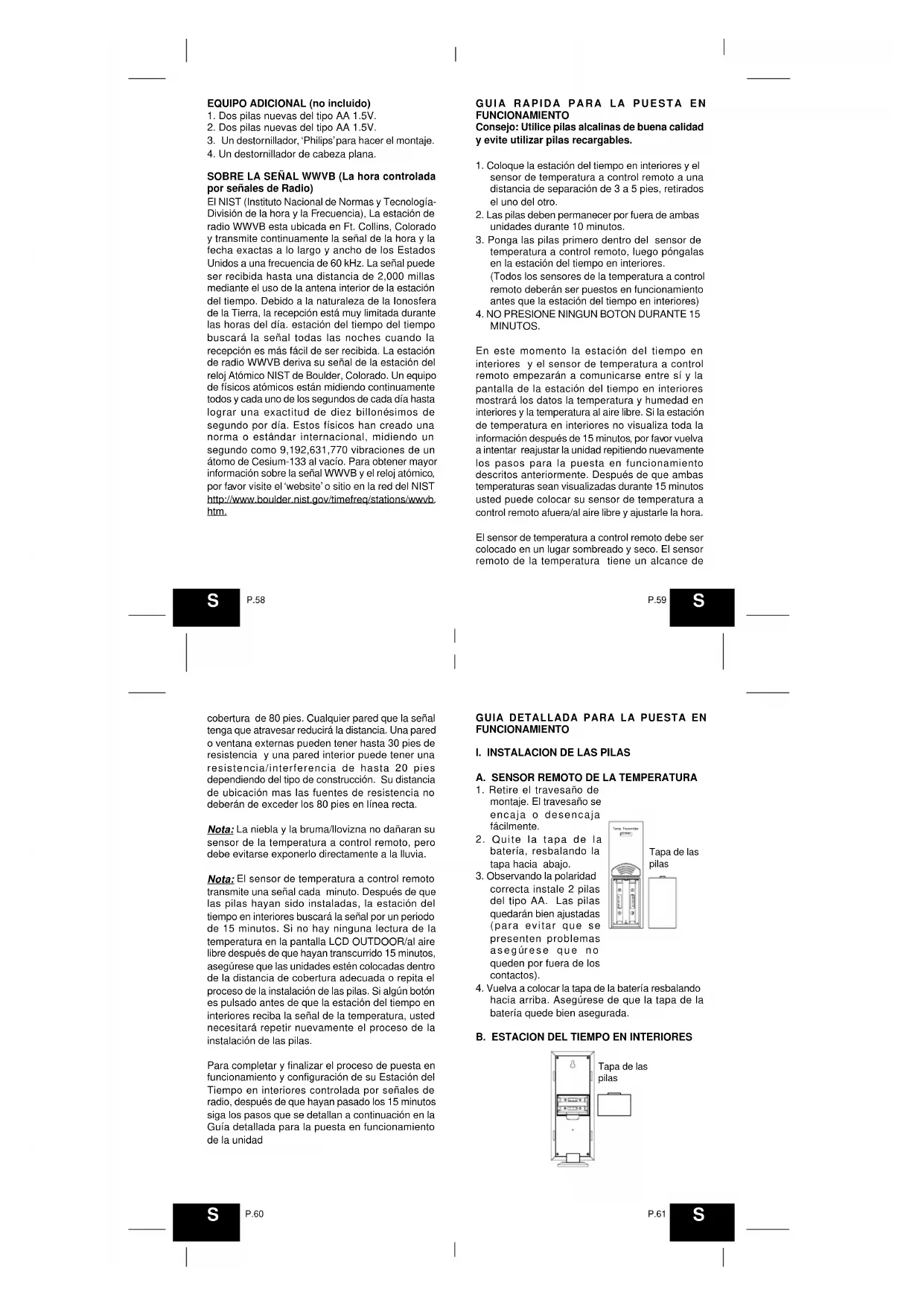 Nota: Inmediatamente después de que se hayan instalado las pilas, la pantalla LCD (Pantalla de Cristal de Líquido) se encenderá/titilará. Dentro de pocos segundos se visualizarán los datos de la temperatura en interiores, y la humedad relativa en interiores. Si esto no sucede, entonces retire las pilas durante 10 segundos y vuélvalas a reinstalar. Si la temperatura al aire libre no es visualizada dentro de un periodo de cuatro minutos, retire las pilas de ambas unidades, espere 10 segundos y vuélvalas a reinstalar asegurándose de instalar las pilas primero en el sensor de temperatura a control remoto. La pantallita de la hora mostrará -:— y la unidad empezará a buscar la señal de recepción de WWVB. Si recibe la señal de la hora correctamente (habitualmente durante la noche), entonces visualizará la hora correcta (Preajustada en la hora Oriental). Usted deberá ajustar la zona horaria correcta para que concuerde con su hora local.