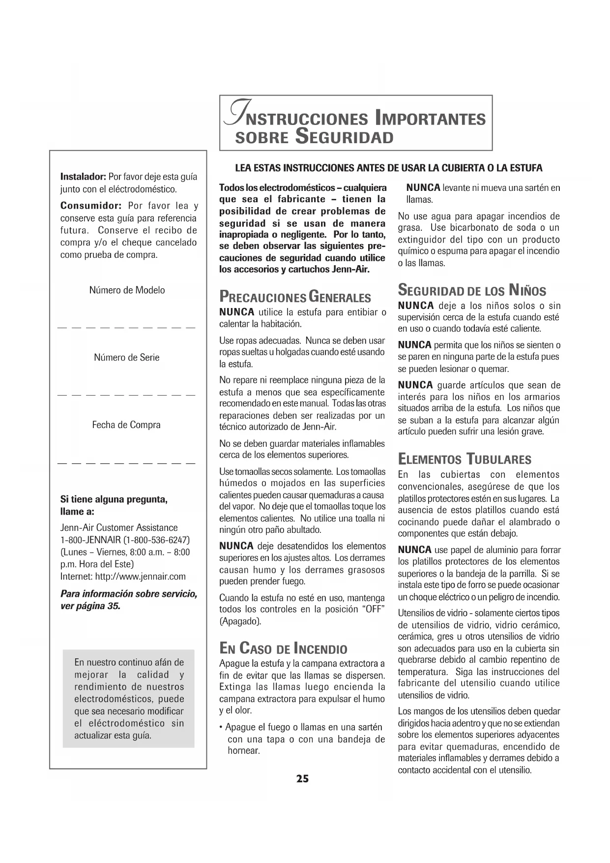 Instalador: Por favor deje esta guíajunto con el eléctrodoméstico.Consumidor: Por favor lea yconserve esta guía para referenciafutura. Conserve el recibo decompra y/o el cheque canceladocomo prueba de compra.Número de Modelo__ __ __ __ __ __ __ __ __ __Número de Serie__ __ __ __ __ __ __ __ __ __Fecha de Compra__ __ __ __ __ __ __ __ __ __Si tiene alguna pregunta,llame a:Jenn-Air Customer Assistance1-800-JENNAIR (1-800-536-6247)(Lunes – Viernes, 8:00 a.m. – 8:00p.m. Hora del Este)Internet: http://www.jennair.comPara información sobre servicio,ver página 35.En nuestro continuo afán demejorar la calidad yrendimiento de nuestroselectrodomésticos, puedeque sea necesario modificarel eléctrodoméstico sinactualizar esta guía.Todos los electrodomésticos – cualquieraque sea el fabricante – tienen laposibilidad de crear problemas deseguridad si se usan de manerainapropiada o negligente. Por lo tanto,se deben observar las siguientes pre-cauciones de seguridad cuando utilicelos accesorios y cartuchos Jenn-Air.