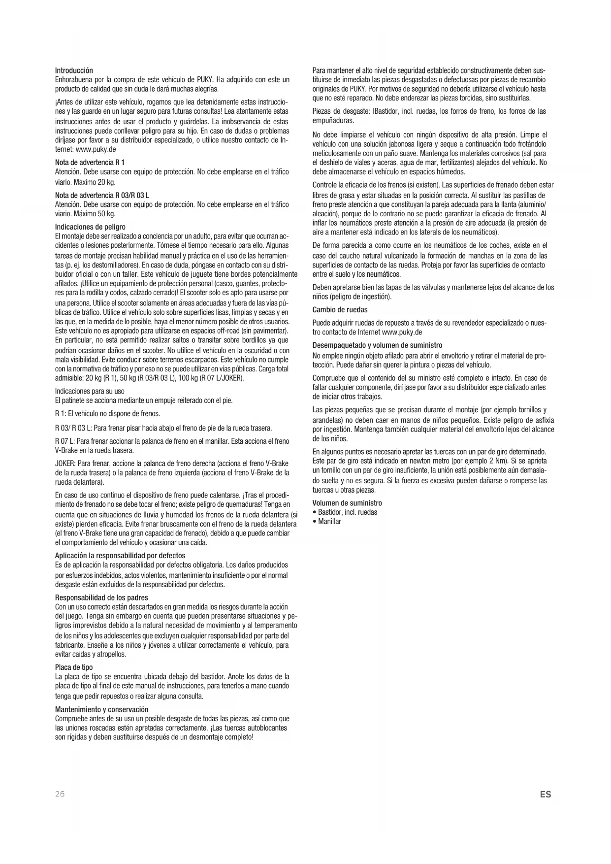 El montaje de ser realizado a conciencia por unadulto, para evitar que occurnan accidentes o lesiones posteriormente. Tómese el tiempo necessario paraarlo. Algunas tareas de montaje precisan habilidad manual y practica en el uso de las herrimantas (p. ej. los destomilladores). En caso de duda,pongase en contacto con su distribuidor oficial o con un taller. Este vehiculo de jugueteiene bordes potencialmente aflados. JUtilice un equipamento de proteccion personal (casco, quantes, protectores para la rodilla y codos, calzo cerrado)! El scooter solo es apto para usarse por una persona. Utilice el scooter solamente en areas adecuadas y fuera de las vias publicas de trafico. Utilice el vehiculo solo sobre superficies lisas, limpias y secas y en las que, en la medida de lo posible, haya el menor numero possible de otheros usarios. Este vehiculo no es apropiado para utilizearse en espacios off-road (sin pavimentar). En particular, no está permitido realizar saltos or transitar sobre bordillos ya que podrian occasionar daños en el scooter. No utilise el vehiculo en la oscurdad o con mala visibiliad. Evite conducir sobre terrenos escarpados. Este vehiculo no cumple con la normala de trafico y por ese no se pueda usar en vias publicas. Carga total admissible: 20kg (R 1), 50kg (R 03/R 03 L), 100kg (R 07 L/JOKER).