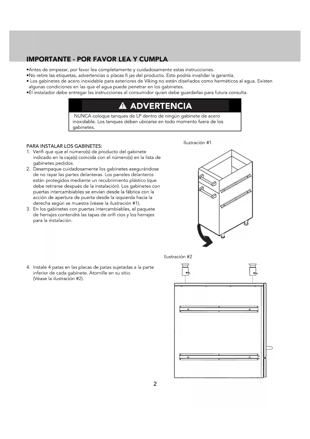 inferior de cada gabinete. Atornille en su sitio. (Véase la ilustración #2). Ilustración #2 NUNCA coloque tanques de LP dentro de ningún gabinete de acero inoxidable. Los tanques deben ubicarse en todo momento fuera de los gabinetes. ADVERTENCIA3 IMPORTANTE - POR FAVOR LEA Y CUMPLA