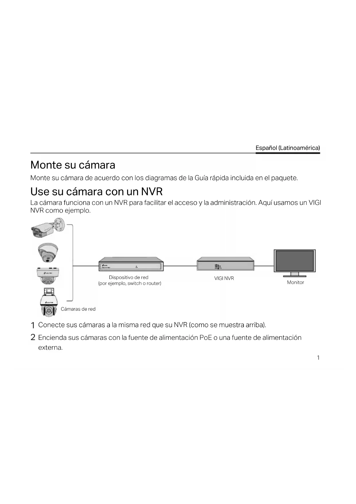Quick Start Guide VIGI Network Camera Images may dier from your actual products. For technical support, the user guide and more information, please visit https://www.tp-link.com/support. 7106509976 REV1.3.0 © 2022 TP-Link01 / Español (Latinoamérica) 05 / Français 09 / Português Brasil 13 / Türkçe 17 / CONTENTS1 Español (Latinoamérica) Monte su cámara Monte su cámara de acuerdo con los diagramas de la Guía rápida incluida en el paquete. Use su cámara con un NVR La cámara funciona con un NVR para facilitar el acceso y la administración. Aquí usamos un VIGI NVR como ejemplo. Dispositivo de red (por ejemplo, switch o router) VIGI NVR Monitor Cámaras de red