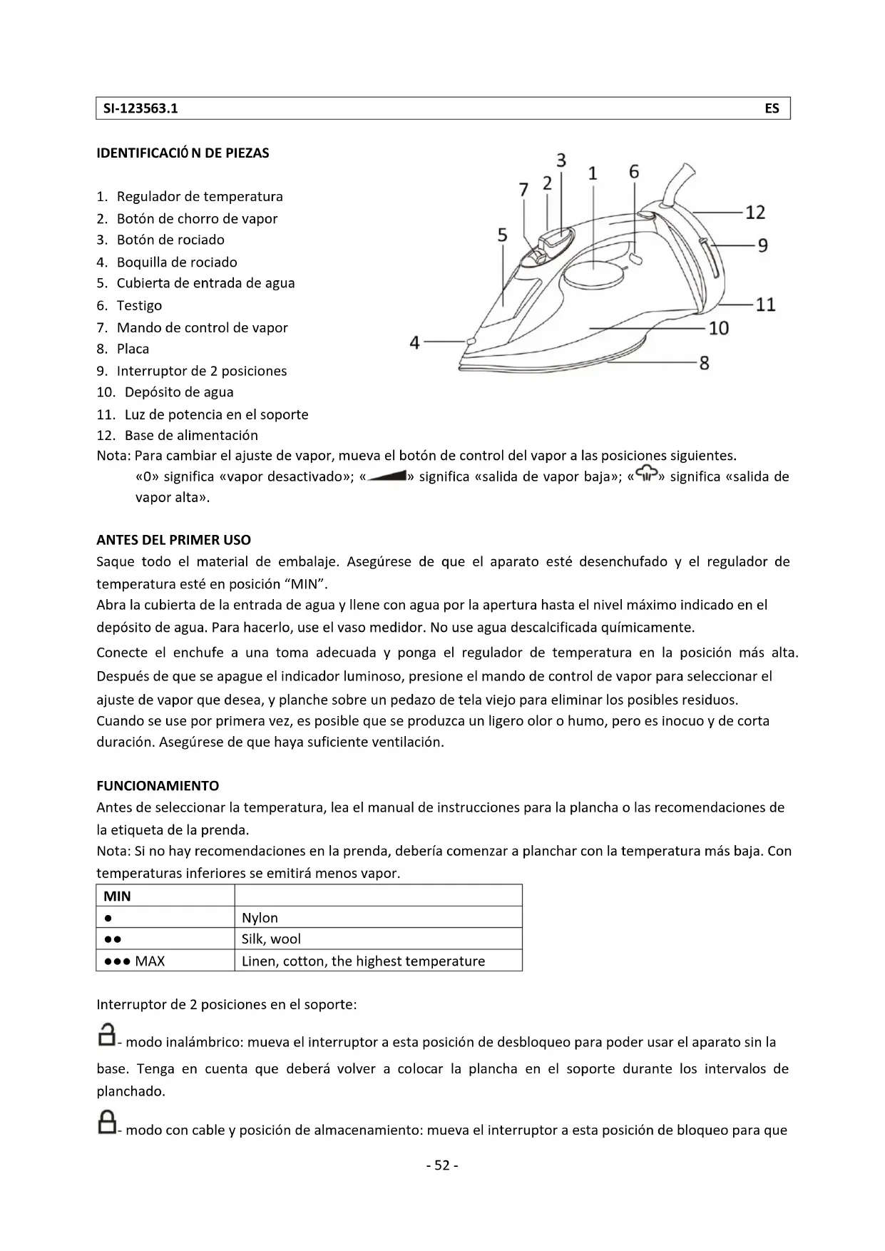 Saque todo el material de embalaje. Asegúrese de que el aparato esté desenchufado y el regulador de temperatura esté en posición “MIN”. Abra la cubierta de la entrada de agua y llene con agua por la apertura hasta el nivel máximo indicado en el depósito de agua. Para hacerlo, use el vaso medidor. No use agua descalcificada químicamente. Conecte el enchufe a una toma adecuada y ponga el regulador de temperatura en la posición más alta. Después de que se apague el indicador luminoso, presione el mando de control de vapor para seleccionar el ajuste de vapor que desea, y planche sobre un pedazo de tela viejo para eliminar los posibles residuos. Cuando se use por primera vez, es posible que se produzca un ligero olor o humo, pero es inocuo y de corta duración. Asegúrese de que haya suficiente ventilación. FUNCIONAMIENTO Antes de seleccionar la temperatura, lea el manual de instrucciones para la plancha o las recomendaciones de la etiqueta de la prenda. Nota: Si no hay recomendaciones en la prenda, debería comenzar a planchar con la temperatura más baja. Con temperaturas inferiores se emitirá menos vapor. MIN