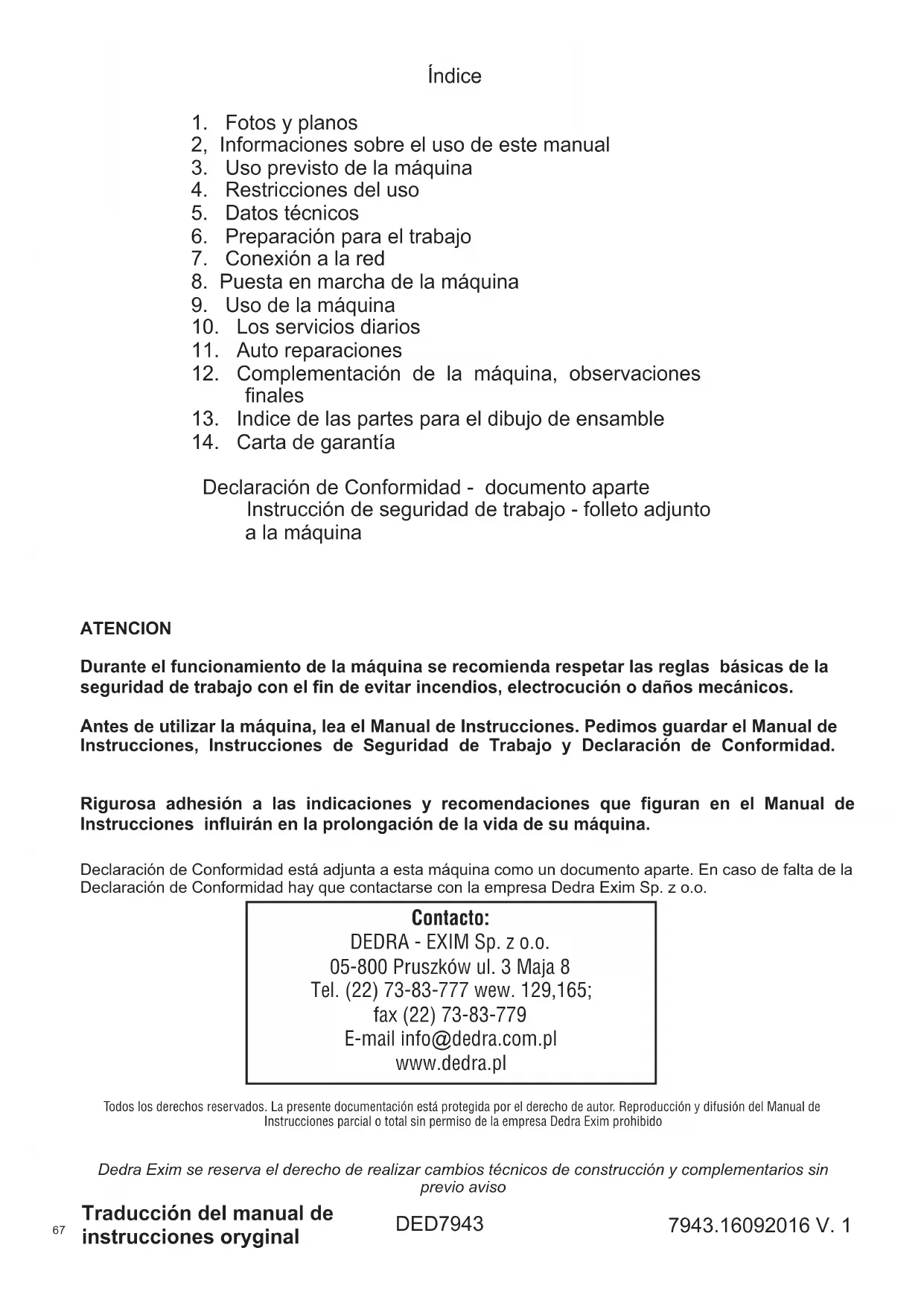 RTIONS R EALISEES Date de la déclartion de réparation Date de la réalisation de réparation Signature de la personne faisant la réparation Etendue de réparation ( définition des causes) FR67 ATENCION Durante el funcionamiento de la máquina se recomienda respetar las reglas básicas de la seguridad de trabajo con el fin de evitar incendios, electrocución o daños mecánicos. Antes de utilizar la máquina, lea el Manual de Instrucciones. Pedimos guardar el Manual de Instrucciones, Instrucciones de Seguridad de Trabajo y Declaración de Conformidad. Rigurosa adhesión a las indicaciones y recomendaciones que figuran en el Manual de Instrucciones influirán en la prolongación de la vida de su máquina. Contacto: DEDRA - EXIM Sp. z o.o. 05-800 Pruszków ul. 3 Maja 8 Tel. (22) 73-83-777 wew. 129,165; fax (22) 73-83-779 E-mail info@dedra.com.pl www.dedra.pl Todos los derechos reservados. La presente documentación está protegida por el derecho de autor. Reproducción y difusión del Manual de Instrucciones parcial o total sin permiso de la empresa Dedra Exim prohibido Dedra Exim se reserva el derecho de realizar cambios técnicos de construcción y complementarios sin previo aviso Declaración de Conformidad está adjunta a esta máquina como un documento aparte. En caso de falta de la Declaración de Conformidad hay que contactarse con la empresa Dedra Exim Sp. z o.o. Índice