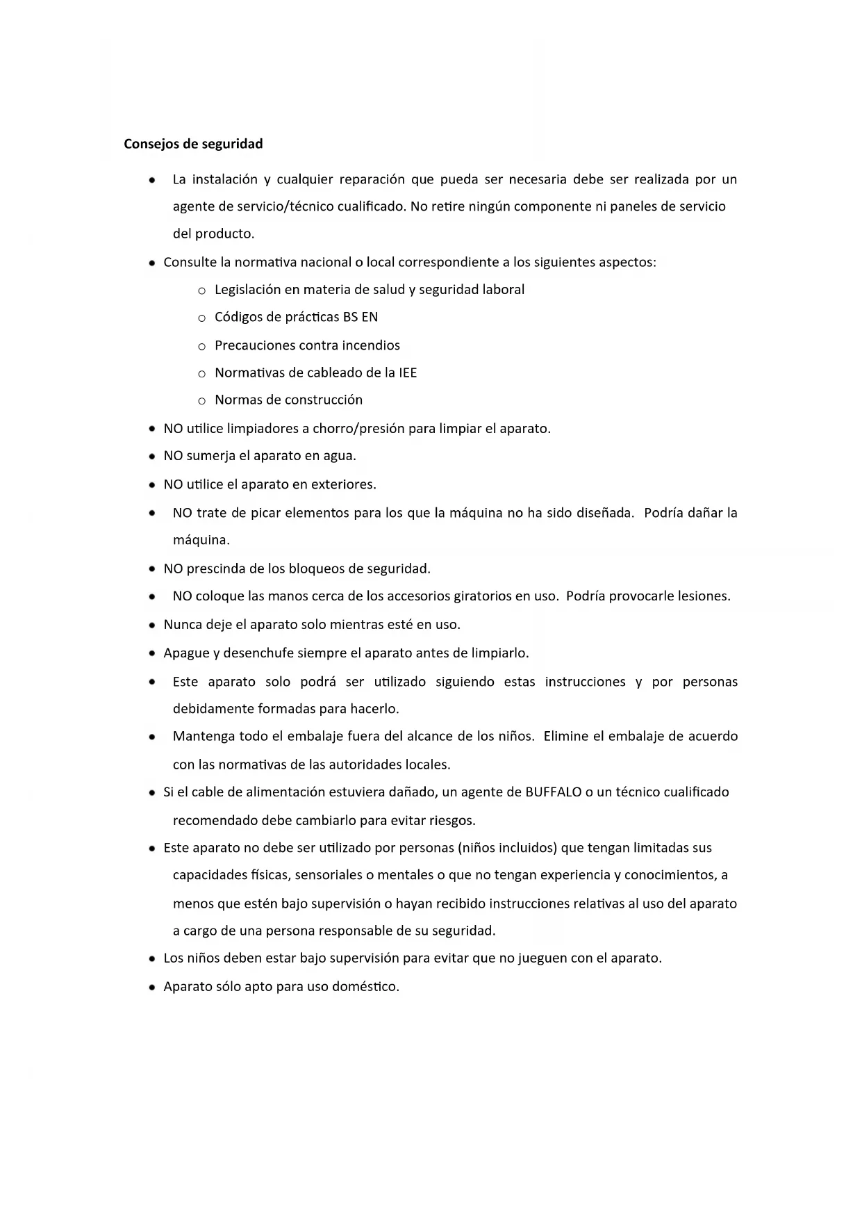 - Este aparato no debe ser utilisé por personas (ninos incluidos) que tengan limitadas sus capacities físicas, sensoriales o mentales o que no tengan experiencia y conocimientos, a menos que estén bajo supervisión o hayan recibido instrucciones relativas al uso del aparato a cargo de una persona responsable de su seguridad.