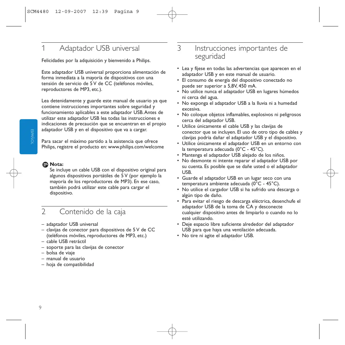 - Solución ESPAÑOL SCM4480 El adaptador USB no carga el dispositivo conectado – El voltaje del dispositivo no coincide con el del adaptador USB.