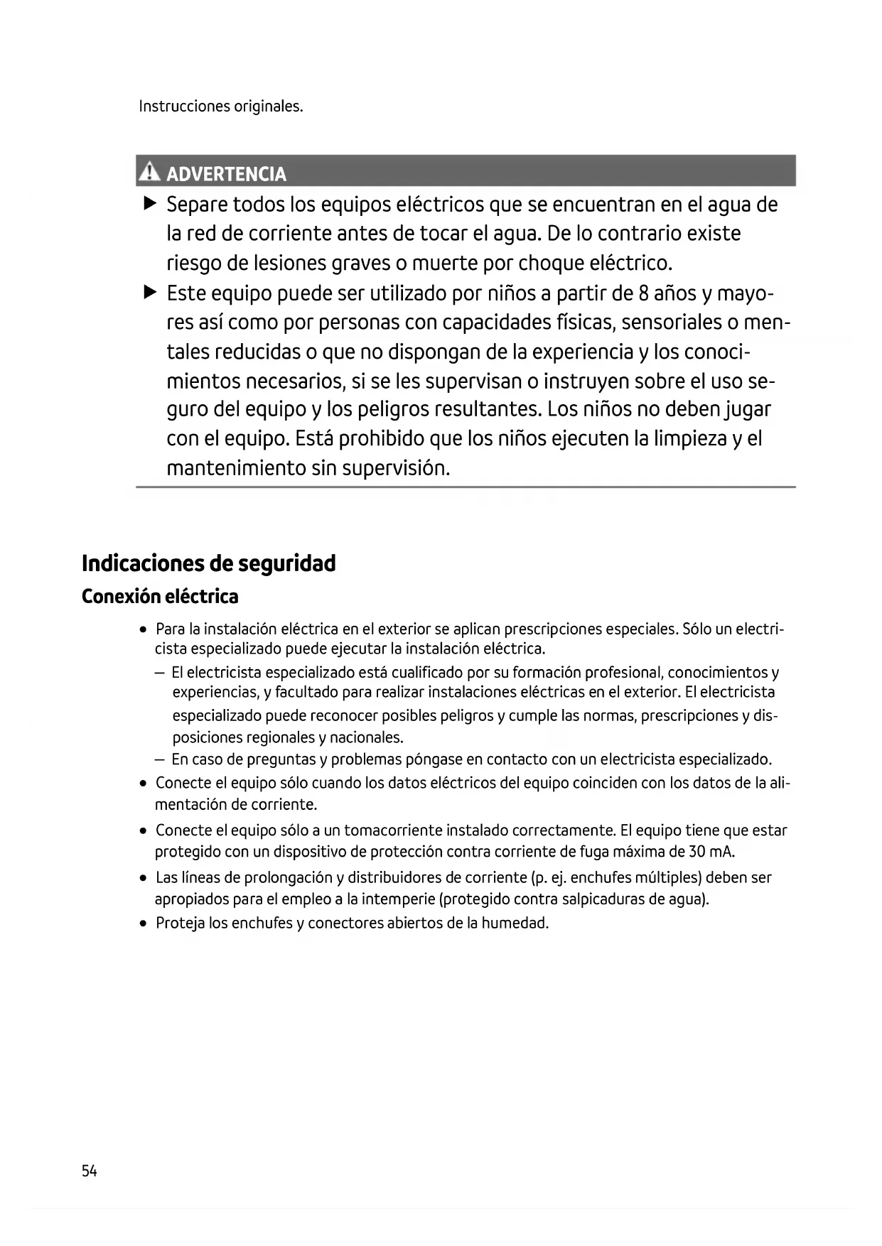 ADVERTENCIA Separe todos los equipos eléctricos que se encuentran en el agua de la red de corriente antes de tocar el agua. De lo contrario existe riesgo de lesiones graves o muerte por choque eléctrico. Este equipo puede ser utilizado por niños a partir de 8 años y mayo- res así como por personas con capacidades físicas, sensoriales o men- tales reducidas o que no dispongan de la experiencia y los conoci- mientos necesarios, si se les supervisan o instruyen sobre el uso se- guro del equipo y los peligros resultantes. Los niños no deben jugar con el equipo. Está prohibido que los niños ejecuten la limpieza y el mantenimiento sin supervisión.