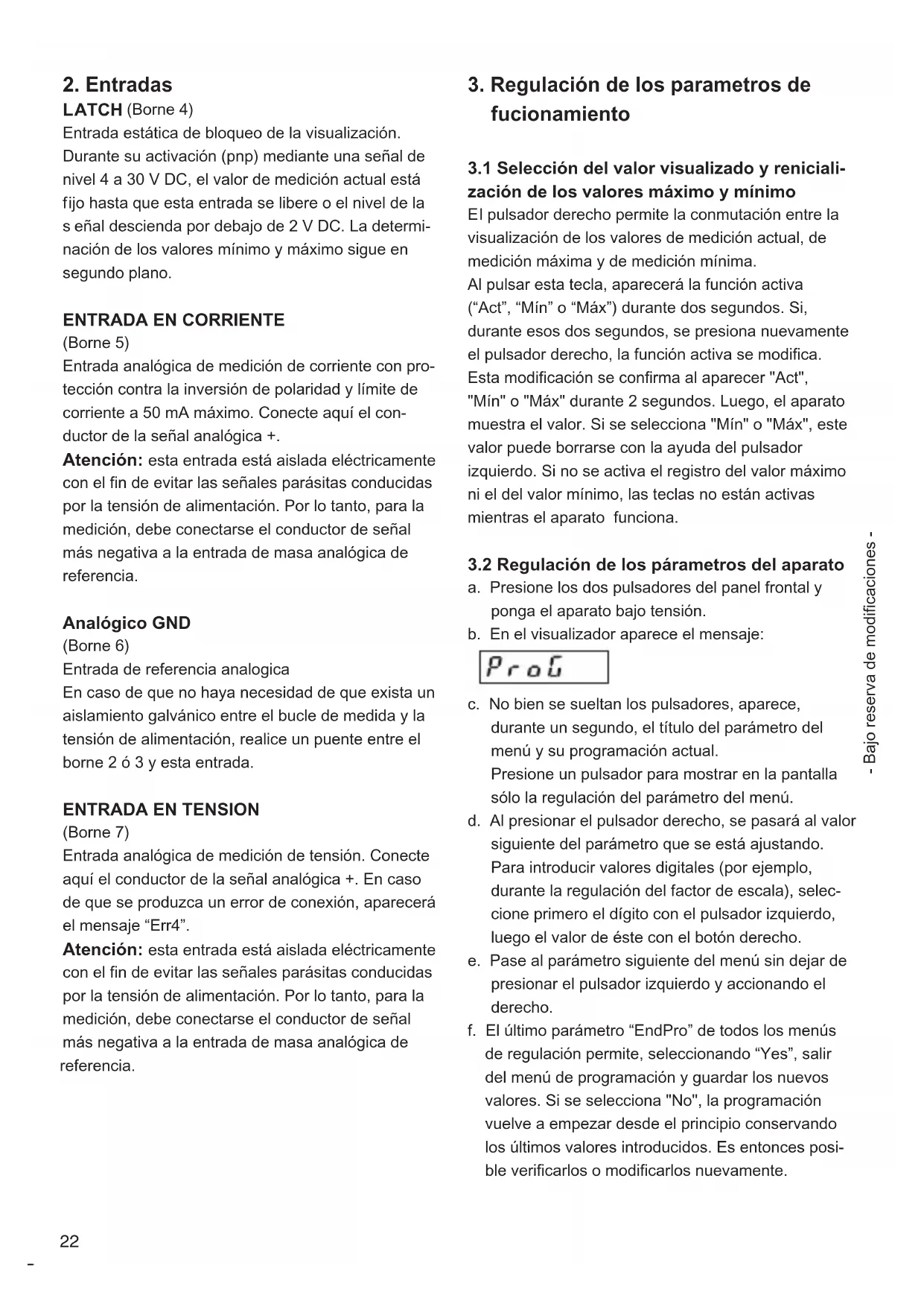 a. Presione los dos pulsadores del panel frontal y ponga el aparato bajo tensión. b. En el visualizador aparece el mensaje: c. No bien se sueltan los pulsadores, aparece, durante un segundo, el título del parámetro del menú y su programación actual. Presione un pulsador para mostrar en la pantalla sólo la regulación del parámetro del menú. d. Al presionar el pulsador derecho, se pasará al valor siguiente del parámetro que se está ajustando. Para introducir valores digitales (por ejemplo, durante la regulación del factor de escala), selec- cione primero el dígito con el pulsador izquierdo, luego el valor de éste con el botón derecho. e. Pase al parámetro siguiente del menú sin dejar de presionar el pulsador izquierdo y accionando el derecho. f. El último parámetro “EndPro” de todos los menús de regulación permite, seleccionando “Yes”, salir del menú de programación y guardar los nuevos valores. Si se selecciona "No", la programación vuelve a empezar desde el principio conservando los últimos valores introducidos. Es entonces posi- ble verificarlos o modificarlos nuevamente. - Bajo reserva de modificaciones -23