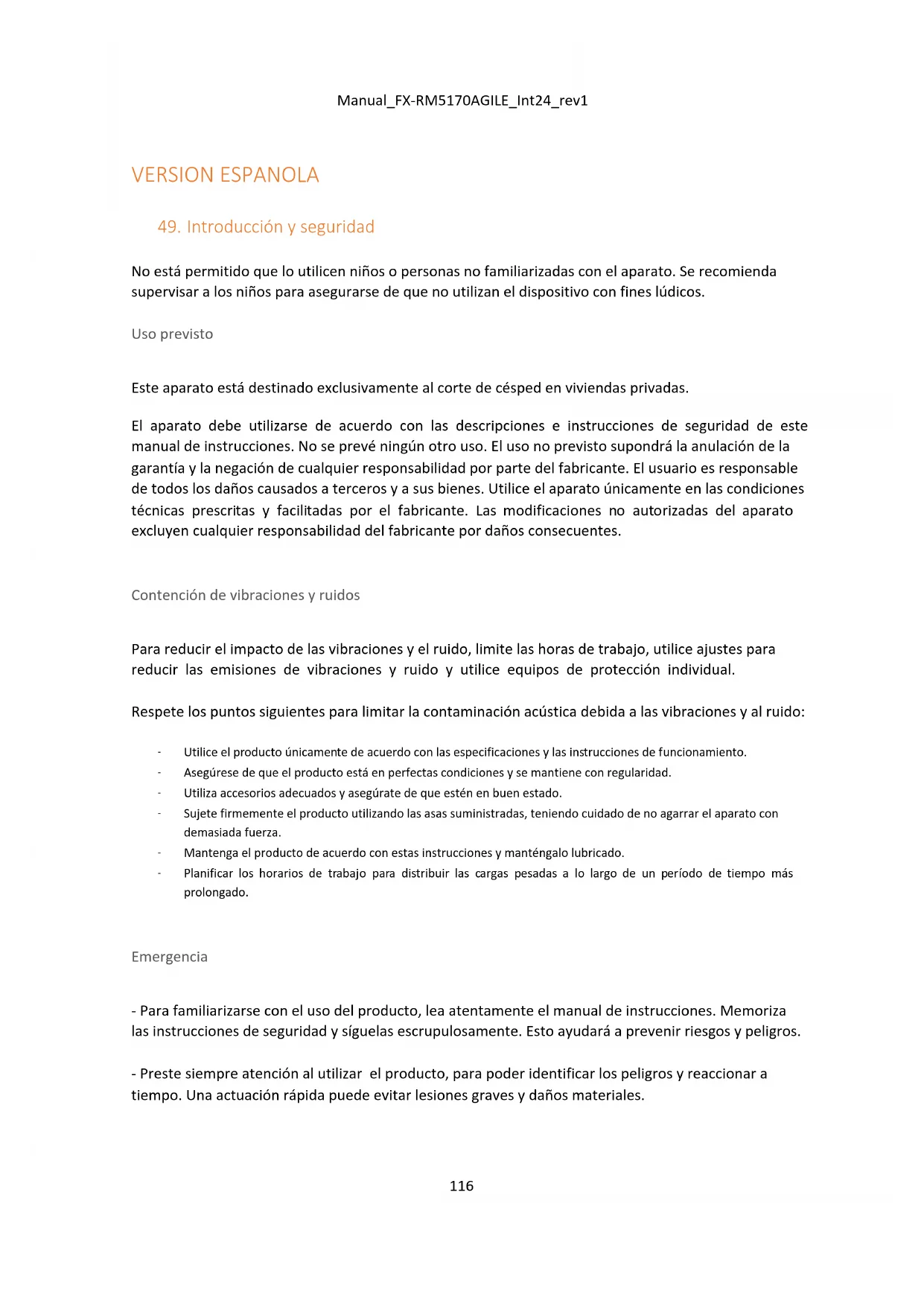 Durante el uso No encienda el aparato si hay personas (especialmente niños) o animales en las inmediaciones. Asegúrese de que los niños no utilicen el aparato para jugar. Deje de trabajar si observa la presencia de personas (especialmente niños) o animales domésticos en las proximidades. Trabajar en pendientes pronunciadas puede ser peligroso. Asegúrate de tener una posición estable y corta lentamente. Corte siempre transversalmente a la pendiente y no hacia arriba o hacia abajo. Tenga especial cuidado al cambiar de dirección. Existe riesgo de vuelco. No corte en pendientes pronunciadas. Tenga especial cuidado al desplazarse hacia atrás al cortar y tirar del cortacésped hacia usted. No vuelque el cortacésped al arrancar el motor. Mantenga la distancia de seguridad indicada en el marco de la empuñadura. No encienda el motor hasta que sus pies estén a una distancia segura de la cuchilla de corte. Tenga cuidado y no toque la cuchilla de corte giratoria. Apague el cortacésped antes de darle la vuelta o transportarlo, por ejemplo, hacia o desde el césped o por caminos. Nunca conduzca sobre grava con el motor en marcha. Existe el riesgo de ser golpeado por piedras. Antes de levantar o transportar el cortacésped, apague el motor y espere a que se detenga la cuchilla de corte. No ajuste la altura de corte hasta que el motor esté apagado y la cuchilla se haya detenido. No abra nunca la trampilla de escape con el motor en marcha. Antes de retirar el recogedor, apague el motor y espere a que se detenga la cuchilla de corte. Después de vaciar el recogedor, vuelva a colocarlo con cuidado y asegúrese de que está bien sujeto al cortacésped. Si es posible, no corte la hierba mojada. No trabaje con la máquina para jardín en un entorno en el que exista riesgo de explosión debido a la presencia de líquidos, gases o polvo inflamables. Cuando deje de trabajar, no deje nunca la unidad desatendida y guárdela en un lugar seguro. Después del uso Apague el dispositivo, retire la batería y coloque el dispositivo en un lugar seguro. Mantenga el aparato fuera del alcance de los niños. Asegúrese de que las tomas de aire de la unidad estén limpias. Mantenga todas las tuercas, pernos y tornillos apretados para garantizar que el cortacésped funcione con seguridad. Compruebe con frecuencia que el recogedor de hierba no esté desgastado ni dañado. Utilice únicamente una cuchilla de corte diseñada para este cortacésped. Siga las instrucciones de instalación y retire previamente la batería (sólo modelo eS).Manual_FX-RM5170AGILE_Int24_rev1