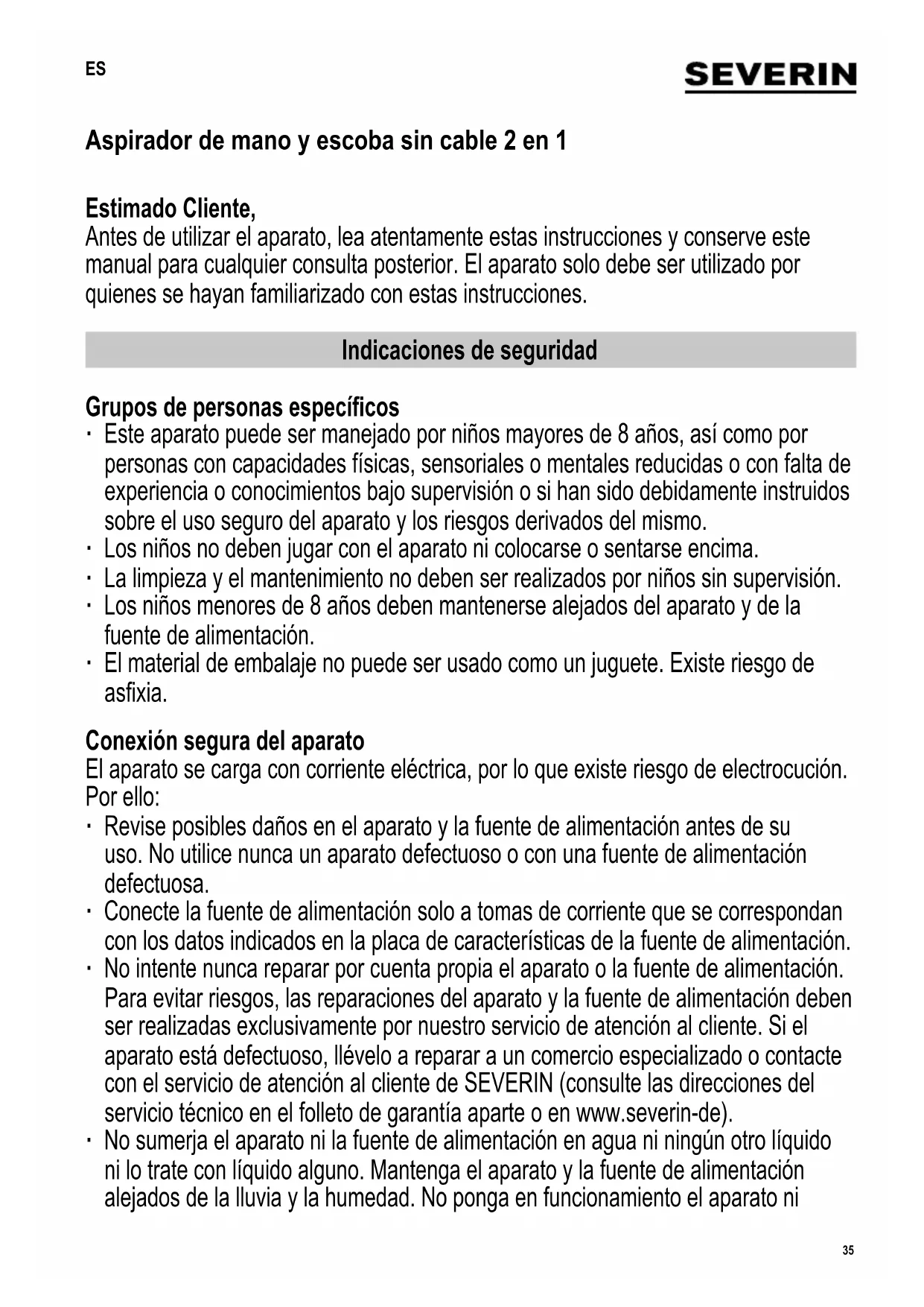 TIP: Voor de reiniging geen agressieve, schurende reinigingsmiddelen of harde borstels gebruiken. Apparaat opbergen ∙ Apparaat en toebehoren koel, droog en buiten bereik van kinderen bewaren. ∙ Druk om het apparaat eenvoudig op te bergen op de toets en klap de handgreep in.34 142 x 208 mm Bestelnummer Toebehoren/reserveonderdeel 9814-048 Filterset 6982-048 Stofreservoir met lter 2361-048 Netvoeding met aansluitleiding 3709-048 Vloermondstuk 3627-048 Borstelrol voor vloermondstuk 0024-048 Korte voegenzuigmond 9812-048 Lange kierenzuiger 9811-048 Borstelopzet Problemen oplossen Problemen zelf oplossen Om problemen te voorkomen, is het belangrijk om de stofbak regelmatig te legen en bij deze gelegenheid de lters te controleren en deze afhankelijk van de verontreiniging te reinigen. Mocht u desondanks nog proble- men met het apparaat hebben, controleer dan aan de hand van de volgende tabel of u het probleem zelf op kunt lossen. Zorg er voor dat het apparaat is uitgeschakeld is en niet wordt opgeladen voor u naar een fout gaat zoeken. Probleem Mogelijke oorzaak / Oplossing Het apparaat kan niet ingeschakeld worden. De accu is volledig leeg, de LED licht niet meer op. Het apparaat uitschakelen en de accu laden. ►Hoofdstuk „Accu laden“ Het apparaat kan niet geladen worden (de LED’s knipperen niet). De netvoeding is niet correct ingeplugd. Controleer of de netvoeding correct in de laadbus van het handapparaat zit. Controleren of de netvoeding correct in het stopcontact zit. Bij gebruik van de laadbus aan de achterzijde van de handgreep controleren, of de stekker correct in de laadbus zit en het handapparaat correct is ingeklikt. ►Hoofdstuk „Accu laden“ Accu is vol, maar apparaat neemt nauwelijks vuil op. Het stofreservoir moet geledigd worden of het lter gereinigd. ►Hoofdstuk „Apparaat reinigen en onderhouden“ De bedrijfsduur wordt steeds korter. De borstelrol is vuil en moet gereinigd worden, ►hoofdstuk “Borstelrol reinigen“ Het lter moet gereinigd worden. ►Hoofdstuk „Apparaat reinigen en onderhouden“ De borstelrol draait traag of onregelmatig. De borstelrol is vuil, en moet gereinigd worden. ►Hoofdstuk “Borstelrol reinigen“ Als u het probleem niet kunt oplossen met behulp van deze tabel, bel dan onze Service-hotline op (zie contactgegevens in het afzonderlijk garantieboekje). Verwijderen Apparaten en accu’s, die met dit symbool zijn gemarkeerd, moeten gescheiden van het huisvuil worden verwijderd. Deze apparaten en de accu’s bevatten waardevolle grondstoffen die gerecycleerd kunnen worden. Een correcte verwijdering beschermt het milieu en de gezondheid van de mensen om u heen. Lever het apparaat met de accu afzonderlijk voor verwijdering in bij de daarvoor bestemde inzamelpunten. De plaatselijke overheid resp. uw vakhandelaar geven meer informatie over het correct verwijderen.35 142 x 208 mm Aspirador de mano y escoba sin cable 2 en 1 Estimado Cliente, Antes de utilizar el aparato, lea atentamente estas instrucciones y conserve este manual para cualquier consulta posterior. El aparato solo debe ser utilizado por quienes se hayan familiarizado con estas instrucciones. Indicaciones de seguridad Grupos de personas especícos ∙ Este aparato puede ser manejado por niños mayores de 8 años, así como por personas con capacidades físicas, sensoriales o mentales reducidas o con falta de experiencia o conocimientos bajo supervisión o si han sido debidamente instruidos sobre el uso seguro del aparato y los riesgos derivados del mismo. ∙ Los niños no deben jugar con el aparato ni colocarse o sentarse encima. ∙ La limpieza y el mantenimiento no deben ser realizados por niños sin supervisión. ∙ Los niños menores de 8 años deben mantenerse alejados del aparato y de la fuente de alimentación. ∙ El material de embalaje no puede ser usado como un juguete. Existe riesgo de asxia. Conexión segura del aparato El aparato se carga con corriente eléctrica, por lo que existe riesgo de electrocución. Por ello: ∙ Revise posibles daños en el aparato y la fuente de alimentación antes de su uso. No utilice nunca un aparato defectuoso o con una fuente de alimentación defectuosa. ∙ Conecte la fuente de alimentación solo a tomas de corriente que se correspondan con los datos indicados en la placa de características de la fuente de alimentación. ∙ No intente nunca reparar por cuenta propia el aparato o la fuente de alimentación. Para evitar riesgos, las reparaciones del aparato y la fuente de alimentación deben ser realizadas exclusivamente por nuestro servicio de atención al cliente. Si el aparato está defectuoso, llévelo a reparar a un comercio especializado o contacte con el servicio de atención al cliente de SEVERIN (consulte las direcciones del servicio técnico en el folleto de garantía aparte o en www.severin-de). ∙ No sumerja el aparato ni la fuente de alimentación en agua ni ningún otro líquido ni lo trate con líquido alguno. Mantenga el aparato y la fuente de alimentación alejados de la lluvia y la humedad. No ponga en funcionamiento el aparato ni ES36 142 x 208 mm la fuente de alimentación al aire libre o en espacios con una elevada humedad ambiental. ∙ No toque el aparato ni la fuente de alimentación con las manos mojadas. Para sacar la fuente de alimentación de la toma de corriente, tire siempre directamente de la fuente de alimentación. ∙ Asegúrese de que el cable de la fuente de alimentación no esté doblado, aprisionado ni pase nada por encima de él, tampoco debe entrar en contacto con fuentes de calor, humedad o bordes alados. Asegúrese de que el cable de la fuente de alimentación no pueda causar tropiezos. ∙ Antes de limpiar o realizar el mantenimiento del aparato, así como antes de cambiar los accesorios, se debe apagar el aparato y asegurarse de que la fuente de alimentación no está conectada. Seguridad al manipular baterías ∙ En caso de uso incorrecto de las baterías, existe peligro de lesio