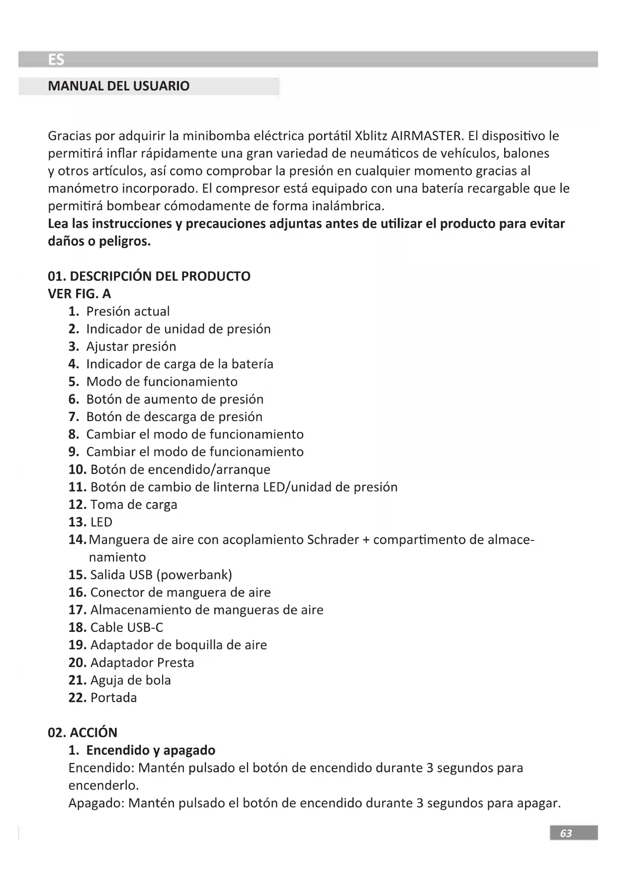 Gracias por adquirir la minibomba eléctrica portál Xblitz AIRMASTER. El disposivo le permirá inar rápidamente una gran variedad de neumácos de vehículos, balones y otros arculos, así como comprobar la presión en cualquier momento gracias al manómetro incorporado. El compresor está equipado con una batería recargable que le permirá bombear cómodamente de forma inalámbrica. Lea las instrucciones y precauciones adjuntas antes de ulizar el producto para evitar daños o peligros.