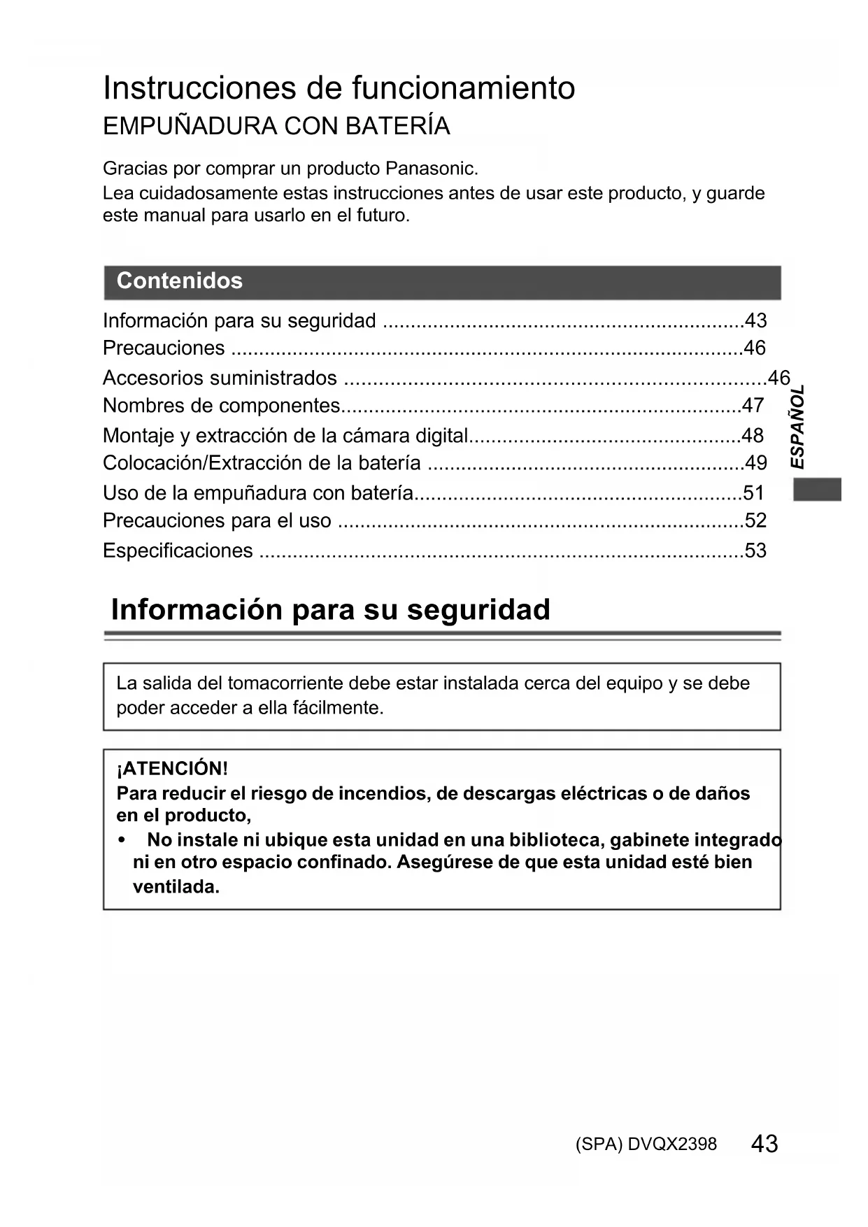 - Especificaciones Información para su seguridad Contenidos La salida del tomacorriente debe estar instalada cerca del equipo y se debe poder acceder a ella fácilmente.¡ATENCIÓN!Para reducir el riesgo de incendios, de descargas eléctricas o de daños en el producto, 0 No instale ni ubique esta unidad en una biblioteca, gabinete integrado ni en otro espacio confinado. Asegúrese de que esta unidad esté bien ventilada. DMW-BG1-DVQX2398.book 43 ページ 2023年8月24日 木曜日 午後3時18分44 DVQX2398 (SPA) ∫ Acerca del paquete de la batería p. 53