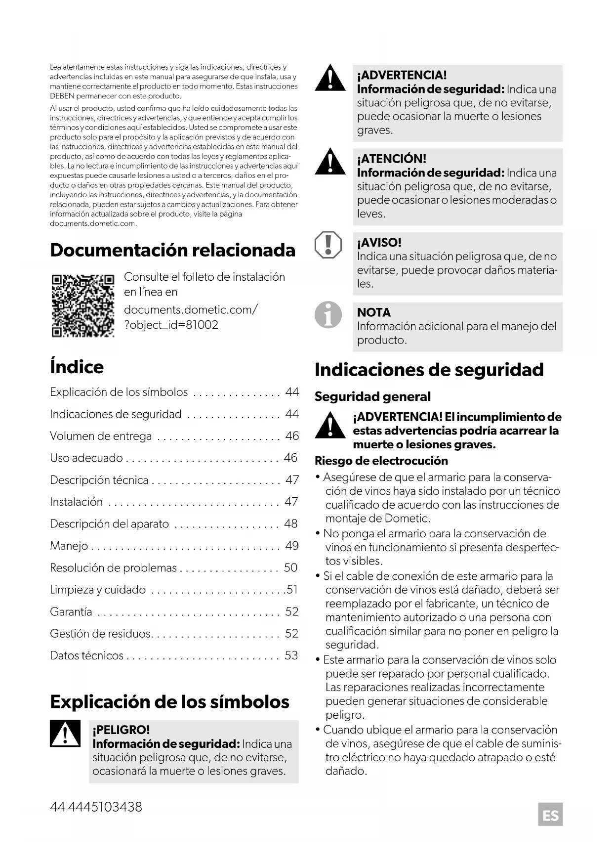 - Cuando ubique el armario para la conservación de vinos, asegúrese de que el cable de suminis- tro eléctrico no haya quedado atrapado o esté dañado. Consulte el folleto de instalación en línea en documents.dometic.com/ ?object_id=81002 ¡PELIGRO! Información de seguridad: Indica una situación peligrosa que, de no evitarse, ocasionará la muerte o lesiones graves. ¡ADVERTENCIA! Información de seguridad: Indica una situación peligrosa que, de no evitarse, puede ocasionar la muerte o lesiones graves. ¡ATENCIÓN! Información de seguridad: Indica una situación peligrosa que, de no evitarse, puede ocasionar o lesiones moderadas o leves. ¡AVISO! Indica una situación peligrosa que, de no evitarse, puede provocar daños materia- les. NOTA Información adicional para el manejo del producto.4445103438 45