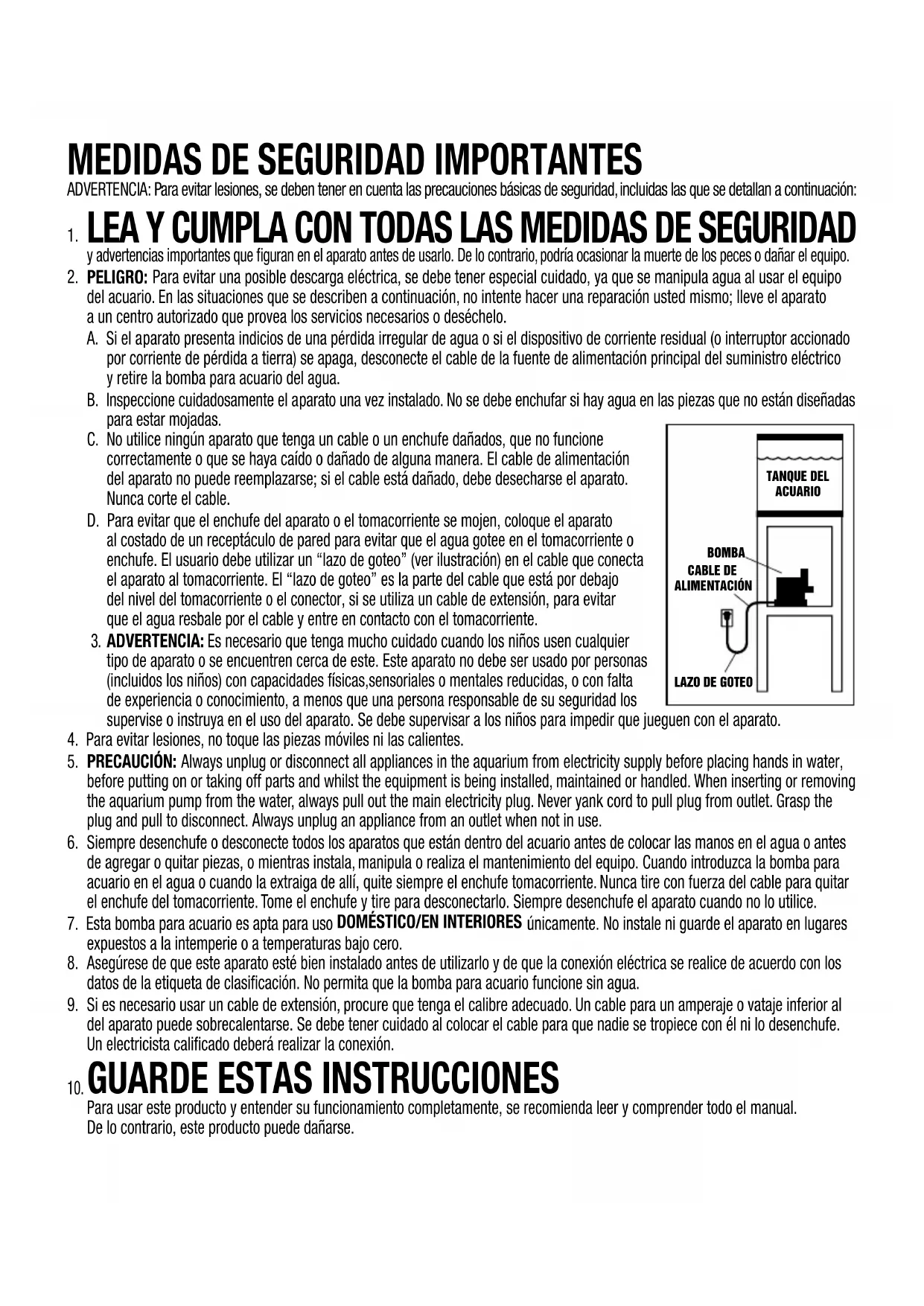 TANQUE DEL ACUARIO BOMBA CABLE DE ALIMENTACIÓN LAZO DE GOTEOsupervise o instruya en el uso del aparato. Se debe supervisar a los niños para impedir que jueguen con el aparato.