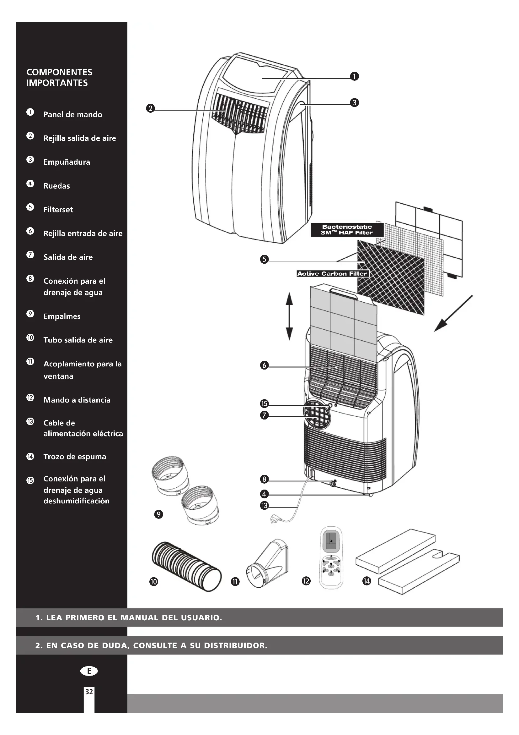 31COMPONENTES IMPORTANTES Panel de mando Rejilla salida de aire Empuñadura Ruedas Filterset Rejilla entrada de aire Salida de aire Conexión para el drenaje de agua Empalmes Tubo salida de aire Acoplamiento para la ventana Mando a distancia Cable de alimentación eléctrica Trozo de espuma Conexión para el drenaje de agua deshumidificación