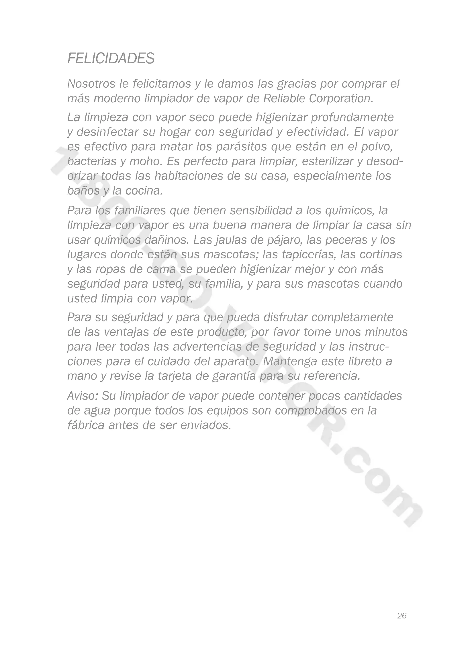 ESPAÑOL 1-800-GO-VAPOR.com26 FELICIDADES Nosotros le felicitamos y le damos las gracias por comprar el más moderno limpiador de vapor de Reliable Corporation. La limpieza con vapor seco puede higienizar profundamente y desinfectar su hogar con seguridad y efectividad. El vapor es efectivo para matar los parásitos que están en el polvo, bacterias y moho. Es perfecto para limpiar, esterilizar y desod- orizar todas las habitaciones de su casa, especialmente los baños y la cocina. Para los familiares que tienen sensibilidad a los químicos, la limpieza con vapor es una buena manera de limpiar la casa sin usar químicos dañinos. Las jaulas de pájaro, las peceras y los lugares donde están sus mascotas; las tapicerías, las cortinas y las ropas de cama se pueden higienizar mejor y con más seguridad para usted, su familia, y para sus mascotas cuando usted limpia con vapor. Para su seguridad y para que pueda disfrutar completamente de las ventajas de este producto, por favor tome unos minutos para leer todas las advertencias de seguridad y las instruc- ciones para el cuidado del aparato. Mantenga este libreto a mano y revise la tarjeta de garantía para su referencia. Aviso: Su limpiador de vapor puede contener pocas cantidades de agua porque todos los equipos son comprobados en la fábrica antes de ser enviados. 1-800-GO-VAPOR.com27