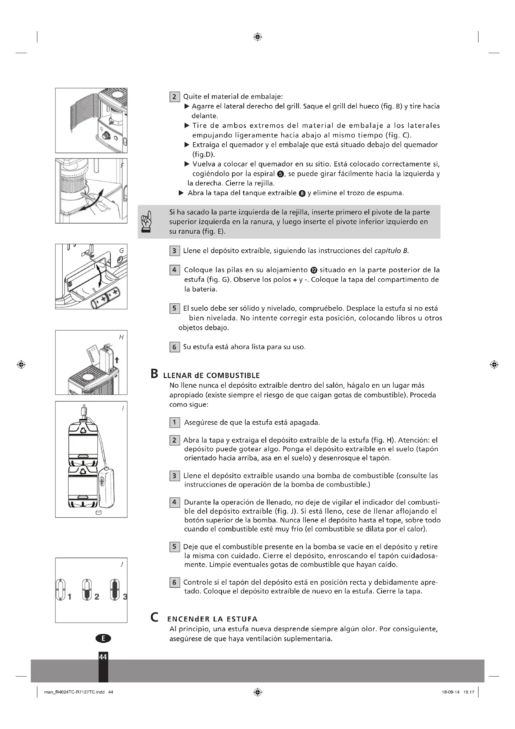 1 Lea primero Las instrucciones de uso.2 en caso de duda, consuLte a su distribuidor. Retiretodoelmaterialdeembalaje(vea capítulo A, fig. A).LleneeldepósitoextraíbleIyespere30minutosantesdeencenderlaestufa (vea capítulo B, fig. I).ColoquelaspilasensualojamientoL(vea capítulo A, fig. G).AsegúresedequelacámaradecombustiónDestáenposiciónrecta(vea capítulo A, fig. F).Enciendalaestufa,girandoelbotónB hacialaderechahastaeltopeyseguidamenteoprimaconcuidadoelbotónC delencendido(vea capítulo C, fig. K y L).Despuésdeencenderlaestufa,sedebeesperarentre10y15minutosparacomprobarquelaestufaestáfuncionandocorrectamente(vea capítulo D).Apaguelaestufa(vea capítulo E).