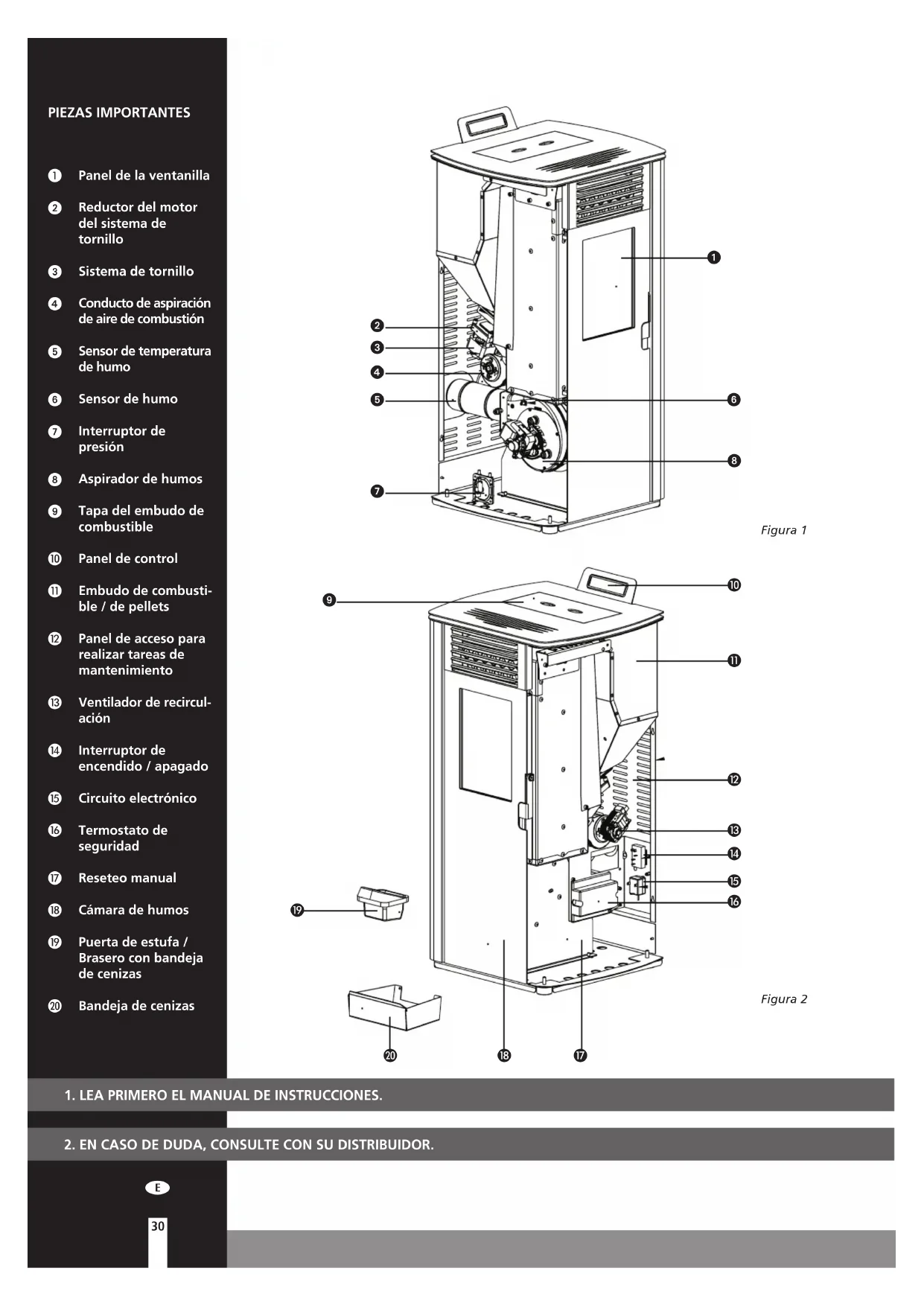 PIEZAS IMPORTANTES Panel de la ventanilla Reductor del motor del sistema de tornillo Sistema de tornillo Conducto de aspiración de aire de combustión Sensor de temperatura de humo Sensor de humo Interruptor de presión Aspirador de humos Tapa del embudo de combustible Panel de control Embudo de combusti- ble / de pellets Panel de acceso para realizar tareas de mantenimiento Ventilador de recircul- ación Interruptor de encendido / apagado Circuito electrónico Termostato de seguridad Reseteo manual Cámara de humos Puerta de estufa / Brasero con bandeja de cenizas Bandeja de cenizas Figura 2 Figura 1