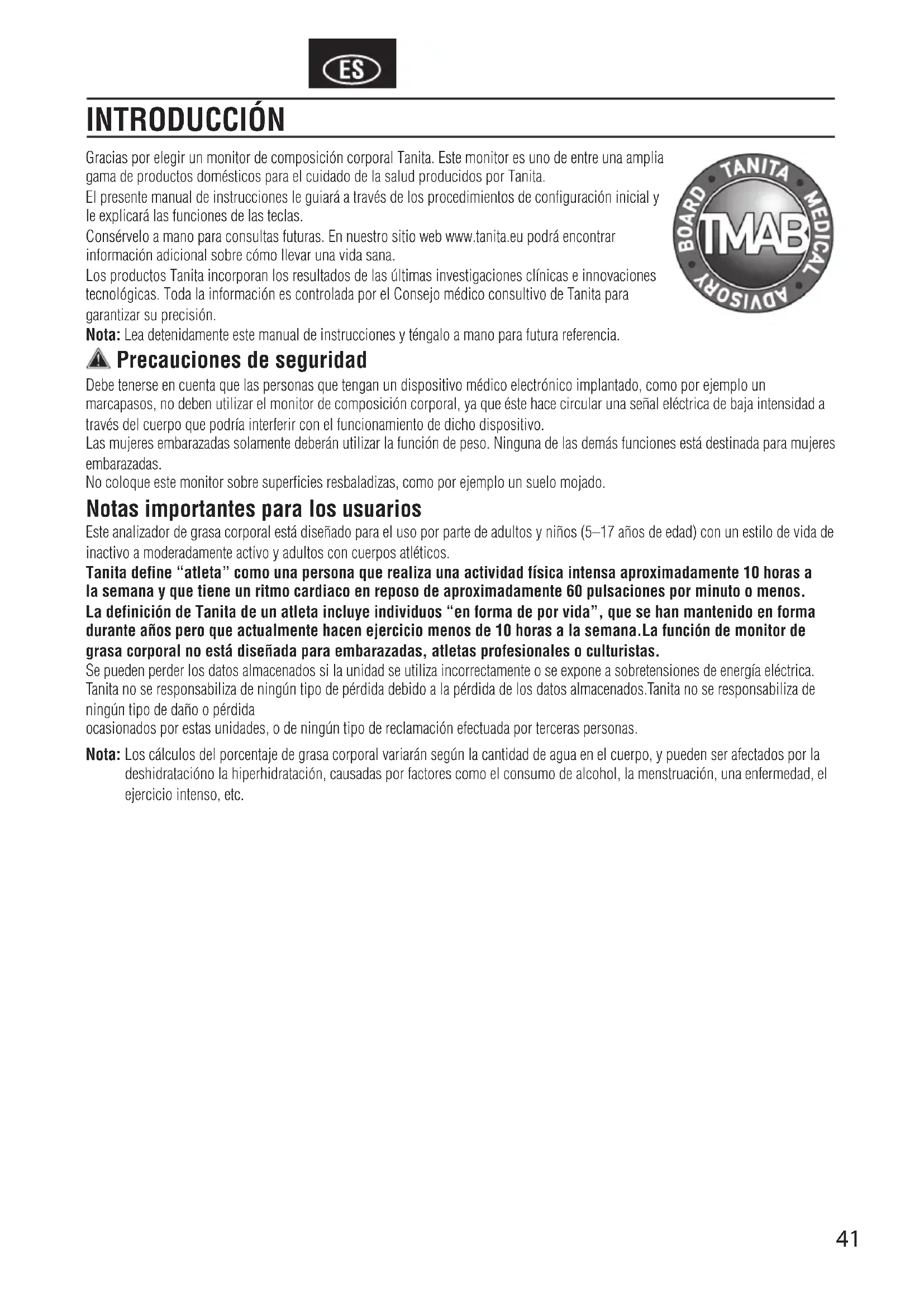 Incrementos di grasso corporeo 0.1% Dati personali 5 memorie Alimentazione 4 AAA pile (incluse) Consumo 30 mA Corrente di misura 50 kHz, 6.25 kHz, 100 µA Non è consentito lo smaltimento comune di batterie e rifiuti solidi urbani! Il consumatore è legalmente vincolato a restituire batterie usate o scariche, depositandole presso gli opportuni centri di raccolta cittadini oppure presso i relativi punti vendita, utilizzando gli appositi contenitori esposti. Prima di smaltire l’apparecchiatura, rimuovere le batterie e depositarle presso gli stessi centri di raccolta succitati. Avviso: Questi marchi sono riportati all’esterno delle confezioni di batterie contenenti sostanze tossiche: Pb Pb = batteria a base di piombo, Cd Cd = batteria a base di cadmio, Hg Hg = batteria a base di mercurio. Questo apparecchio è conforme alla Direttiva EMC 2004/108/ CE e della direttiva RoHS 2011/65/UE.41 INTRODUCCIÓN Gracias por elegir un monitor de composición corporal Tanita. Este monitor es uno de entre una amplia gama de productos domésticos para el cuidado de la salud producidos por Tanita. El presente manual de instrucciones le guiará a través de los procedimientos de configuración inicial y le explicará las funciones de las teclas. Consérvelo a mano para consultas futuras. En nuestro sitio web www.tanita.eu podrá encontrar información adicional sobre cómo llevar una vida sana. Los productos Tanita incorporan los resultados de las últimas investigaciones clínicas e innovaciones tecnológicas. Toda la información es controlada por el Consejo médico consultivo de Tanita para garantizar su precisión. Nota: Lea detenidamente este manual de instrucciones y téngalo a mano para futura referencia. Precauciones de seguridad Debe tenerse en cuenta que las personas que tengan un dispositivo médico electrónico implantado, como por ejemplo un marcapasos, no deben utilizar el monitor de composición corporal, ya que éste hace circular una señal eléctrica de baja intensidad a través del cuerpo que podría interferir con el funcionamiento de dicho dispositivo. Las mujeres embarazadas solamente deberán utilizar la función de peso. Ninguna de las demás funciones está destinada para mujeres embarazadas. No coloque este monitor sobre superficies resbaladizas, como por ejemplo un suelo mojado. Notas importantes para los usuarios Este analizador de grasa corporal está diseñado para el uso por parte de adultos y niños (5–17 años de edad) con un estilo de vida de inactivo a moderadamente activo y adultos con cuerpos atléticos. Tanita define “atleta” como una persona que realiza una actividad física intensa aproximadamente 10 horas a la semana y que tiene un ritmo cardiaco en reposo de aproximadamente 60 pulsaciones por minuto o menos. La definición de Tanita de un atleta incluye individuos “en forma de por vida”, que se han mantenido en forma durante años pero que actualmente hacen ejercicio menos de 10 horas a la semana.La función de monitor de grasa corporal no está diseñada para embarazadas, atletas profesionales o culturistas. Se pueden perder los datos almacenados si la unidad se utiliza incorrectamente o se expone a sobretensiones de energía eléctrica. Tanita no se responsabiliza de ningún tipo de pérdida debido a la pérdida de los datos almacenados.Tanita no se responsabiliza de ningún tipo de daño o pérdida ocasionados por estas unidades, o de ningún tipo de reclamación efectuada por terceras personas. Nota: Los cálculos del porcentaje de grasa corporal variarán según la cantidad de agua en el cuerpo, y pueden ser afectados por la deshidratacióno la hiperhidratación, causadas por factores como el consumo de alcohol, la menstruación, una enfermedad, el ejercicio intenso, etc.42 Instalación de las pilas Abrir la tapa de las pilas situada en la parte posterior de la báscula. Insertar como se indica las pilas AAA suministradas. Nota: Asegúrese de situar correctamente la polaridad de las pilas. Si coloca las pilas de manera incorrecta, el líquido puede derramarse y dañar el suelo. Si no tiene intención de utilizar esta unidad durante un período de tiempo prolongado, se recomienda sacar las pilas antes de guardarla. Tenga en cuenta que es posible que las pilas suministradas de fábrica se hayan gastado con el paso del tiempo. Colocación del monitor Coloque la báscula en una superficie dura y lisa con una vibración mínima para asegurar una medición segura y precisa. Nota: Para evitar posibles lesiones, no pise el borde de la plataforma. Recomendaciones de manejo Este monitor es un instrumento de precisión que utiliza tecnología de vanguardia. Para mantener la unidad en condición óptima, siga estas instrucciones cuidadosamente: