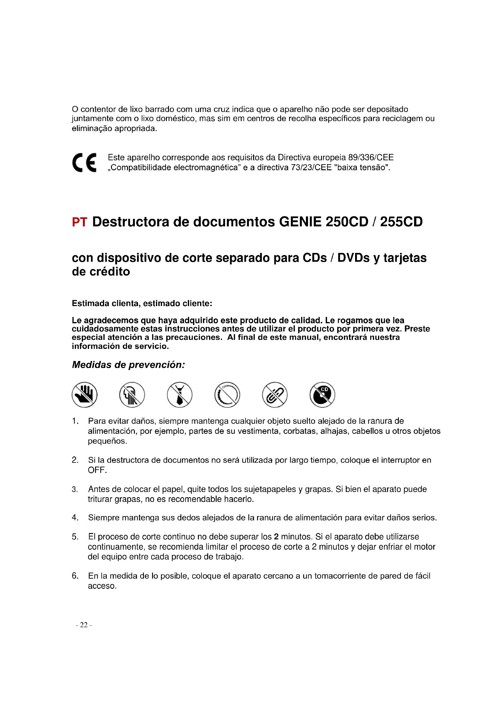 Garantía Gracias por adquirir este producto de GENIE. En caso de que este aparato, en contra de lo esperado, no funcionara correctamente, tome nota de lo siguiente: La garantía tiene un periodo de validez de 24 meses a partir de la fecha de la compra, siempre que se haga un uso adecuado del aparato. Conserve el justificante de compra y el embalaje original del producto. La garantía cubre únicamente defectos de fabricación o de los materiales, pero no los daños por rotura de piezas, como por ejemplo de la carcasa. No se repondrán los aparatos que hayan sufrido daños por un uso inadecuado. La garantía pierde su validez cuando se llevan a cabo reparaciones sin el consentimiento por escrito de nuestro servicio de atención al cliente. Las reparaciones en garantía sólo pueden realizarse adjuntando el justificante de compra: le rogamos que nos avise por teléfono de cualquier devolución. Sólo se admitirán devoluciones a portes pagados acompañadas del correspondiente número de devolución. No se admitirán envíos a portes debidos. Indique por favor en el envío su nombre, dirección completa (calle, código postal, población) y teléfono con prefijo, así como el motivo de la reclamación. Muchas gracias por su comprensión. Línea de atención telefónica: Tel. +49-(0) 6122-72 79 891 ● Fax +49- (0) 6122-705952 ● Correo electrónico: service@genie-online.de Le rogamos que envíe las devoluciones a portes pagados a la siguiente dirección: Dieter Gerth GmbH, -Service- , Berta-Cramer-Ring 22, D-65205 Wiesbaden. Deutschland/Gemany- 26 - Directiva 2002/96/CE sobre el tratamiento, recogida, reciclaje y eliminación de aparatos eléctricos y electrónicos y sus componentes (Residuos de aparatos eléctricos y electrónicos - RAEE). El símbolo tachado de un contenedor de basura indica que el aparato no puede depositarse en un cubo para residuos domésticos; en su lugar, debe llevarse a un centro de recogida debidamente equipado para su reciclaje o eliminación. Este aparato cumple los requisitos de las Directivas 89/336/CEE sobre compatibilidad electromagnética y 73/23/CEE sobre límites de tensión de la UE. CZ GENIE 250CD / 255CD Skartovací přístroj Se separátní řezací hlavou pro CD/ DVD a kreditní karty