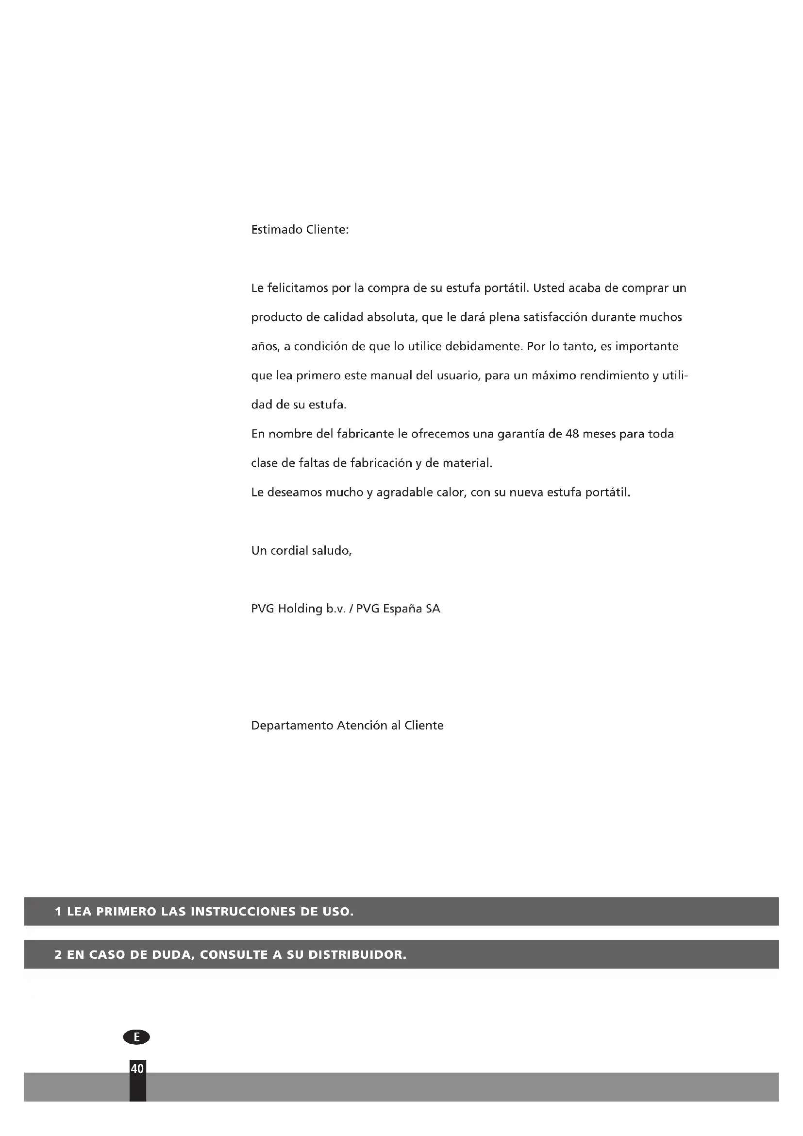39Estimado Cliente: Le felicitamos por la compra de su estufa portátil. Usted acaba de comprar un producto de calidad absoluta, que le dará plena satisfacción durante muchos años, a condición de que lo utilice debidamente. Por lo tanto, es importante que lea primero este manual del usuario, para un máximo rendimiento y utili- dad de su estufa. En nombre del fabricante le ofrecemos una garantía de 48 meses para toda clase de faltas de fabricación y de material. Le deseamos mucho y agradable calor, con su nueva estufa portátil. Un cordial saludo, PVG Holding b.v. / PVG España SA Departamento Atención al Cliente 1 LEA PRIMERO LAS INSTRUCCIONES DE USO. 2 EN CASO DE DUDA, CONSULTE A SU DISTRIBUIDOR.