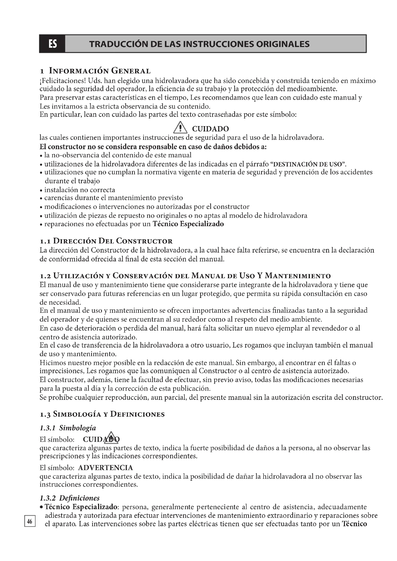 El manual de uso y mantenimiento tiene que considerarse parte integrante de la hidrolavadora y tiene que ser conservado para futuras referencias en un lugar protegido, que permita su rápida consultación en caso de necesidad.