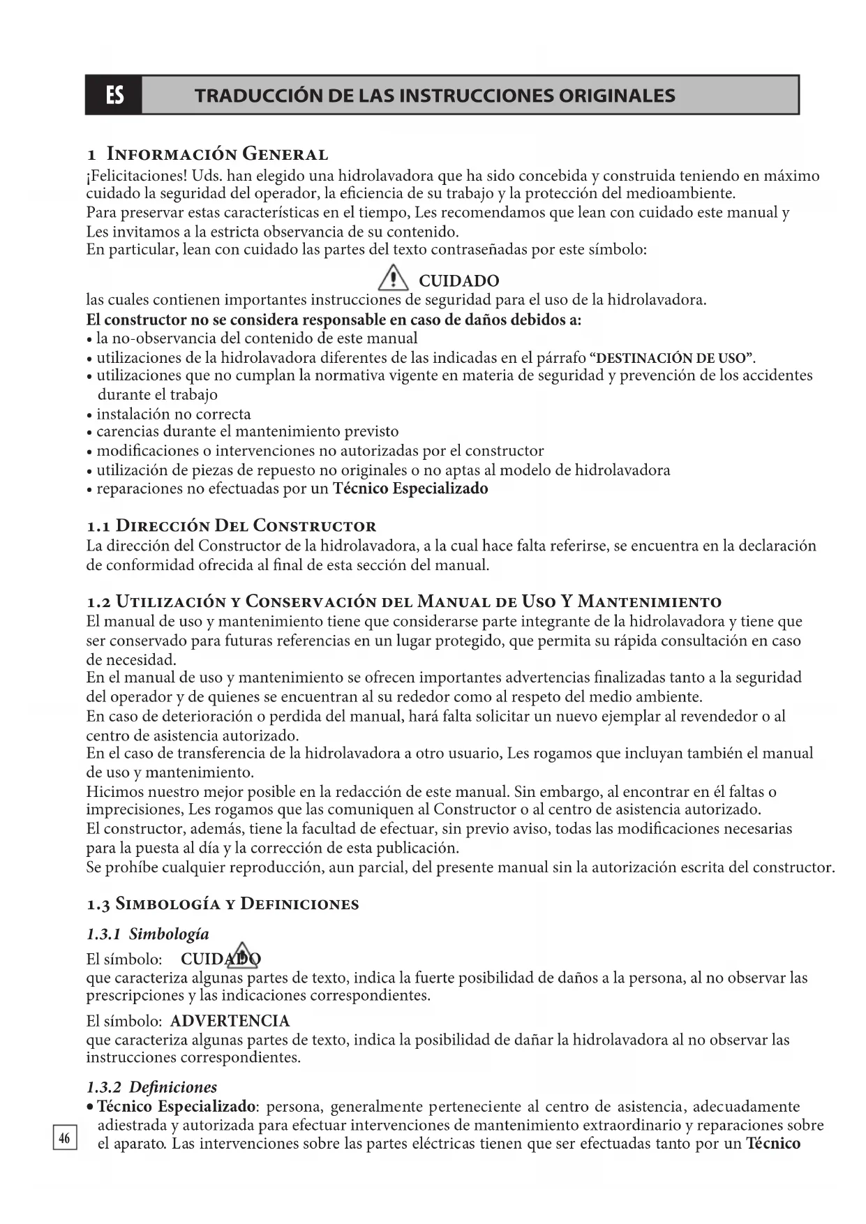 Felicitationes! Uds. han elegido una hidrolavadora que ha sido concebida y construida teniendo en Tmaximo cuidado la seguridad del operador, la eficiencia de su trabajo y la proteccion del medioambiente.