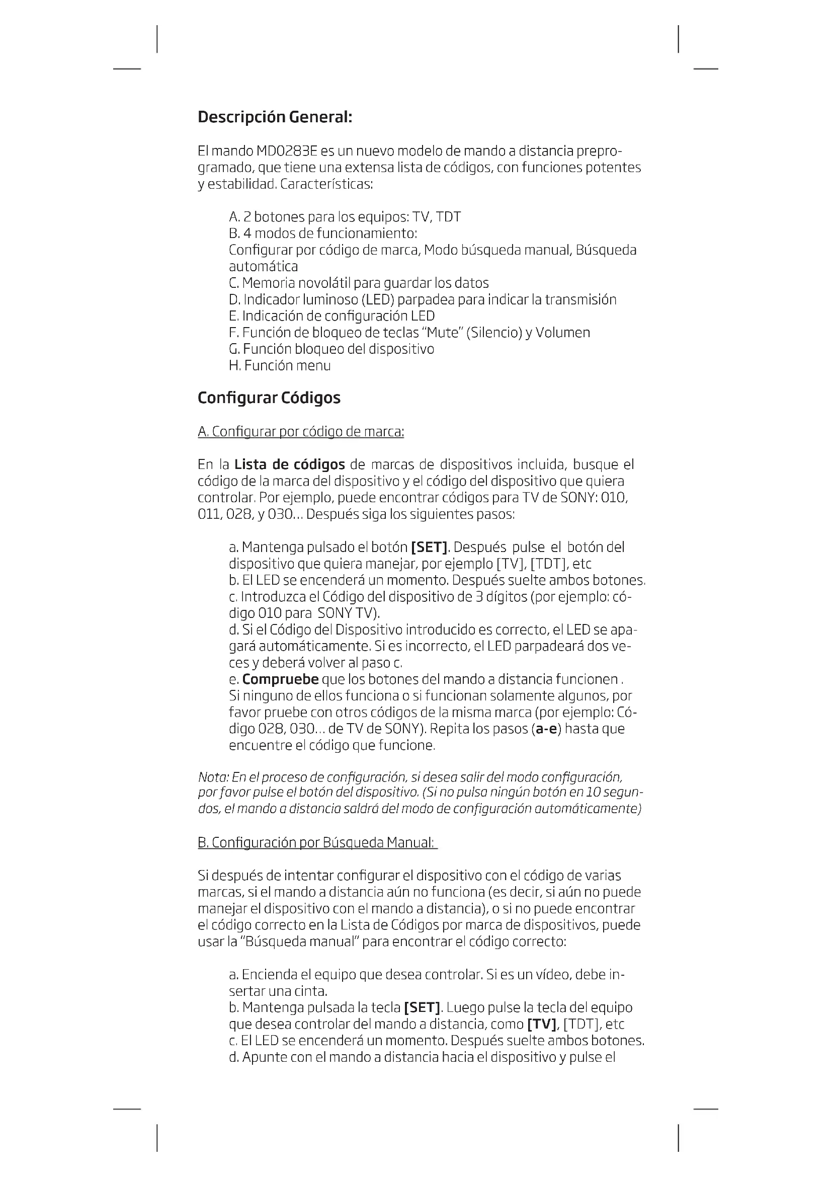md 0283 e manual de usuario mode d’emploi manuale d’uso user manualDescripción General: El mando MD0283E es un nuevo modelo de mando a distancia prepro- gramado, que tiene una extensa lista de códigos, con funciones potentes y estabilidad. Características: A. 2 botones para los equipos: TV, TDT B. 4 modos de funcionamiento: Congurar por código de marca, Modo búsqueda manual, Búsqueda automática C. Memoria novolátil para guardar los datos D. Indicador luminoso (LED) parpadea para indicar la transmisión E. Indicación de conguración LED F. Función de bloqueo de teclas “Mute” (Silencio) y Volumen G. Función bloqueo del dispositivo H. Función menu Congurar Códigos A. Congurar por código de marca: En la Lista de códigos de marcas de dispositivos incluida, busque el código de la marca del dispositivo y el código del dispositivo que quiera controlar. Por ejemplo, puede encontrar códigos para TV de SONY: 010, 011, 028, y 030… Después siga los siguientes pasos: a. Mantenga pulsado el botón [SET]. Después pulse el botón del dispositivo que quiera manejar, por ejemplo [TV], [TDT], etc b. El LED se encenderá un momento. Después suelte ambos botones. c. Introduzca el Código del dispositivo de 3 dígitos (por ejemplo: có- digo 010 para SONY TV). d. Si el Código del Dispositivo introducido es correcto, el LED se apa- gará automáticamente. Si es incorrecto, el LED parpadeará dos ve- ces y deberá volver al paso c. e. Compruebe que los botones del mando a distancia funcionen . Si ninguno de ellos funciona o si funcionan solamente algunos, por favor pruebe con otros códigos de la misma marca (por ejemplo: Có- digo 028, 030… de TV de SONY). Repita los pasos (a-e) hasta que encuentre el código que funcione. Nota: En el proceso de conguración, si desea salir del modo conguración, por favor pulse el botón del dispositivo. (Si no pulsa ningún botón en 10 segun- dos, el mando a distancia saldrá del modo de conguración automáticamente) B. Conguración por Búsqueda Manual: Si después de intentar congurar el dispositivo con el código de varias marcas, si el mando a distancia aún no funciona (es decir, si aún no puede manejar el dispositivo con el mando a distancia), o si no puede encontrar el código correcto en la Lista de Códigos por marca de dispositivos, puede usar la “Búsqueda manual” para encontrar el código correcto: a. Encienda el equipo que desea controlar. Si es un vídeo, debe in- sertar una cinta. b. Mantenga pulsada la tecla [SET]. Luego pulse la tecla del equipo que desea controlar del mando a distancia, como [TV], [TDT], etc c. El LED se encenderá un momento. Después suelte ambos botones. d. Apunte con el mando a distancia hacia el dispositivo y pulse elESP botón [POWER], el mando a distancia entrará en modo “Búsqueda manual” y el LED parpadeará. e. Compruebe si el dispositivo reacciona o no. Si funciona, pase al paso f, si no, repita el paso d cada segundo. f. Compruebe los demás botones. Si funcionan bien todos los boto- nes, pulse el botón del dispositivo para salir del modo búsqueda. Si algunos de los botones no funcionan correctamente repita los pa- sos d-f para encontrar el mejor código. Notas: a. Cuando quiera salir o cambiar el modo búsqueda, pulse el botón del disposi- tivo para salir y el LED se apagará b. Puede utilizar el botón SET para cambiar la dirección de izquierda a derecha o viceversa. C. Conguración por Búsqueda automática: Esta búsqueda es similar a la búsqueda manual con la diferencia de que se transmite la señal de forma automática en vez de tener que pulsar el botón Power durante la búsqueda. a. Encienda el equipo que desea controlar. b. Mantenga pulsada la tecla [SET], al mismo tiempo, pulse y man- tenga pulsada la tecla del equipo que desea controlar. (por ejem- plo: TV) durante más de 3 segundos y luego suelte ambas teclas para iniciar la búsqueda automática. El mando a distancia entrará en modo Búsqueda Automática, el LED parpadeará, y el mando a distancia transmitirá una señal cada 2 segundos automáticamente. c. Vea si el equipo reacciona o no, una vez reaccione, pulse cualquier tecla (excepto la tecla SET) para parar la búsqueda. d. Compruebe si las demás teclas funcionan correctamente. Si la mayoria de teclas no funcionan, haga el proceso de Auto Búsqueda otra vez para encontrar el siguiente código y pruebe hasta que en- cuentre un código que funcione. Nota: a. Debe dirijir el mando a distancia hacia el equipo que desea controlar duran- te la Búsqueda Automática. b. Cuando desee salir del modo Búsqueda Automática, pulse cualquier tecla (excepto la tecla SET), y el LED se apagará. La búsqueda habrá nalizado. c. Cuando la búsqueda del mando pase por todos los códigos (después de 10 minutos), el mando saldrá de la búsqueda automática automáticamente. d. En caso de no detener la búsqueda a tiempo cuando el dispositivo reaccio- ne, puede usar la búsqueda manual para volver al código anterior Función Bloqueo de teclas Volumen y Silencio: a. Pulse el botón del dispositivo del cual quiera bloquear teclas volu- men y el mute, como la [TV], [TDT], etc. b. Mantenga pulsado [SET] y pulse el botón [5], después suelte am- bos botones, el LED parpadeará dos veces y se apagará, los botones de volumen y silencio (mute) de ese dispositivo estarán bloquea- dos. c. Si quiere desbloquear los botones del volumen y mute, mantenga pulsado el botón [SET] y pulse el [6], suelte ambos botones y el LED parpadeará dos veces antes de apagarse. Ya estarán desbloquea- das ambas funciones.Bloquear/Desbloquear dispositivos Puede usar la función “Bloquear dispositivo” para bloquear el código del dispositivo actual y este código no podrá cambiarse con el ajuste por código ni por búsqueda manual/automática. Puede usar “Desbloquear” para salir de esta función. a. Pulse el botón del dispositivo que quiera bloquear, como la [TV], el [TDT], etc b. Mantenga pu