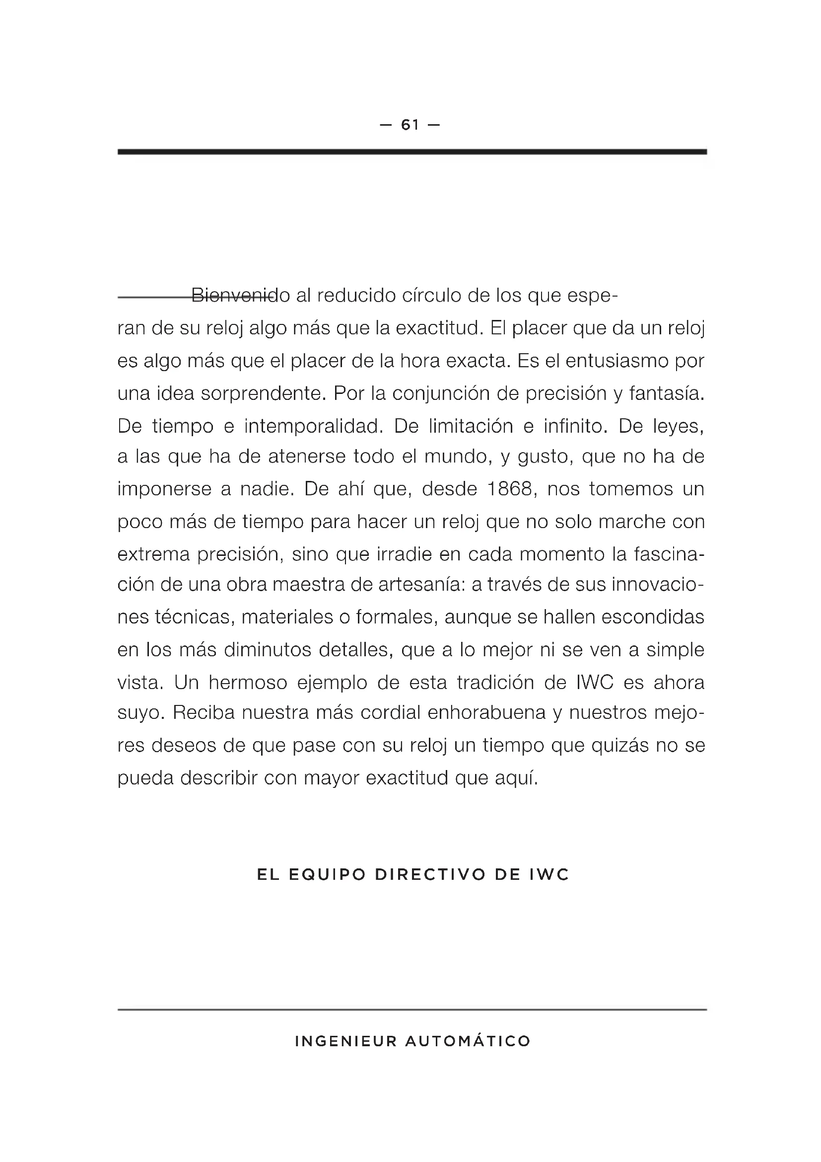 1— 64 — ingenieur autOMáticO las FunciOnes de la cOrOna X — Posición normal (atornillada) 0 — Posición para dar cuerda 1 — Ajuste de la fecha 2 — Ajuste de la hora la pOsición nOrMal Este reloj está dotado de una corona atornillada. El enroscamien- to (posición normal, X) impide un desajuste involuntario de la hora o de la fecha, y la caja del reloj está así, además, protegida contra la penetración del agua. Para quitar el seguro, desenrosque la corona girándola hacia la izquierda, con lo que se quedará auto- máticamente en la posición 0, posición para dar cuerda. Empu- jando la corona hasta la posición X y girándola al mismo tiempo hacia la derecha, volverá a enroscarla fijamente. X 0 1 2— 65 — ingenieur autOMáticO la pOsición para dar cuerda En la posición para dar cuerda (0) puede darse cuerda al movi- miento automático también a mano. Para poner en marcha el movimiento bastan unas pocas vueltas de corona. Es mejor, sin embargo, darle cuerda con unas 20 vueltas de corona, ya que de esta manera se consigue la máxima exactitud de marcha. el ajuste de la Fecha Si el mes tiene menos de 31 días, tendrá que poner a mano el primer día del mes siguiente. Para ello, desenrosque la corona atornillada y tire de ella hasta la posición 1. Girándola hacia la izquierda, podrá cambiar la fecha (conmutación directa). No haga ningún ajuste rápido entre las 20 y las 2 horas, ya que durante este lapso el movimiento efectúa el cambio automático de la fecha.— 66 — ingenieur autOMáticO el ajuste de la hOra Tire de la corona hasta la posición 2. Así se detiene el movi- miento. Para una puesta en hora al segundo exacto, es conve- niente que el movimiento se detenga cuando el segundero pasa por el 60. Haga avanzar entonces el minutero unas marcas de minutos más allá de la hora deseada. Moviéndolo ligeramente hacia atrás, posicione finalmente el minutero exactamente sobre la marca del minuto correspondiente. Procediendo de esta for- ma, se asegurará que, al ponerse en marcha el movimiento, el minutero avance sin retraso alguno. Para poner en marcha el segun- dero, vuelva a meter la corona en la posición 0. Al ajustar la hora, tenga en cuenta el cambio de fecha que se produce a medianoche (24 horas). Si el cambio de fecha se efectuara ya a las 12 horas del mediodía, adelante las agujas otras 12 horas. Importante: en las posiciones 0, 1 y 2, el reloj sigue siendo her- mético; sin embargo, para el uso normal, deberá volver a enros- car la corona (posición X).— 67 — ingenieur autOMáticO la indicación de la hOra en la Oscuridad La esfera, la aguja de las horas y el minutero de su reloj están dotados de elementos luminiscentes que le permitirán ver la hora sin dificultad incluso en la oscuridad absoluta. Como punto de referencia sirve el elemento luminiscente situado a la altura de las 12 horas. el ManejO y ajuste del Brazalete de Metal El brazalete de metal se ha diseñado para que pueda ajustarlo al tamaño de su muñeca sin ninguna dificultad. Usted mismo puede ajustarlo quitándole o añadiéndole eslabones.— 68 — ingenieur autOMáticO la división del Brazalete Abra el cierre desplegable apretando los pulsadores laterales. Coloque el brazalete sobre una base firme con su parte exterior hacia abajo. Para evitar que el brazalete y la base se rayen, coloque un paño por debajo. Con la herramienta adjunta, podrá presio- nar hacia abajo el perno de fijación en el punto de separación deseado (1) y, con la segunda herramienta, empujar simultáneamente el perno articulado unos 3 milímetros hacia fuera (2). Saque del brazalete el perno articulado que ahora sobresale (3). Ahora, el braza- lete está dividido.— 69 — ingenieur autOMáticO la deterMinación de lOs eslaBOnes a eXtraer Coloque el reloj con el cierre desplegable cerrado alrededor de su muñeca y, en base a la superposición, calcule la can- tidad de eslabones sobrantes que podrá desenganchar de la manera descrita: si tiene que quitar varios eslabones, le reco- mendamos repartir equitativamente su nú- mero entre ambas mitades del brazalete para que el cierre quede aproximadamente en el centro de la muñeca.— 70 — ingenieur autOMáticO la eXtracción de eslaBOnes y el enganche del Brazalete Repita los pasos 1 a 3 con la distancia re- cién determinada desde el primer punto de separación. Quite los eslabones que haya separado y una el brazalete acortado. Introduzca el perno articulado en el brazalete (1). Con la herramienta adjunta, presione hacia abajo el perno de fijación (2) y, al mismo tiempo, vuelva a insertar al ras el perno articulado en el brazalete (3). El perno de fijación debe subirse nuevamente hasta quedar al ras con el borde superior del es- labón de seguridad. Asegúrese finalmente de que los pernos de fijación queden bien ajustados. Conserve bien los eslabones sobrantes y la herramienta de separación para posibles futuros ajustes.— 71 — ingenieur autOMáticO la herMeticidad al agua Los datos de la hermeticidad al agua en los relojes IWC se expresan en bar y no en metros. Los datos en metros, que frecuentemente se indican en la industria relojera como dato de la hermeticidad al agua, no pueden equipararse con la profundidad de inmersión en una operación de buceo, tal como demuestran frecuentemente los procesos de ensayo utilizados. La indicación de los metros no pue- de, por lo tanto, conducir a conclusiones respecto a las condicio- nes reales de utilización en situaciones de humedad, en ambiente mojado y en o bajo el agua. Usted encontrará las recomendacio- nes de uso en relación con la hermeticidad de su reloj en Internet bajo www.iwc.com/water-resistance. Su concesionario autorizado por IWC (Official Agent) le informará muy amplia y gustosamente sobre este particular. Para asegurar un funcionamiento impecable de su reloj, éste tiene que ser revisado al menos una vez al año por un centro de servicio IWC. Si el reloj ha estado sometido a