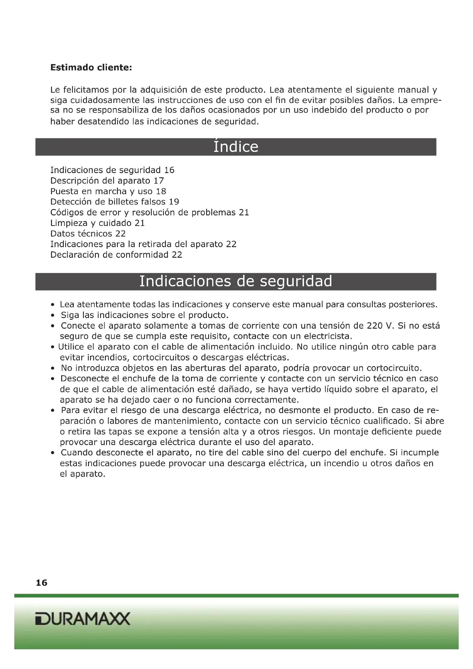 Estimado cliente: Le felicitamos por la adquisición de este producto. Lea atentamente el siguiente manual y siga cuidadosamente las instrucciones de uso con el n de evitar posibles daños. La empre- sa no se responsabiliza de los daños ocasionados por un uso indebido del producto o por haber desatendido las indicaciones de seguridad. Índice Indicaciones de seguridad 16 Descripción del aparato 17 Puesta en marcha y uso 18 Detección de billetes falsos 19 Códigos de error y resolución de problemas 21 Limpieza y cuidado 21 Datos técnicos 22 Indicaciones para la retirada del aparato 22 Declaración de conformidad 22 Indicaciones de seguridad