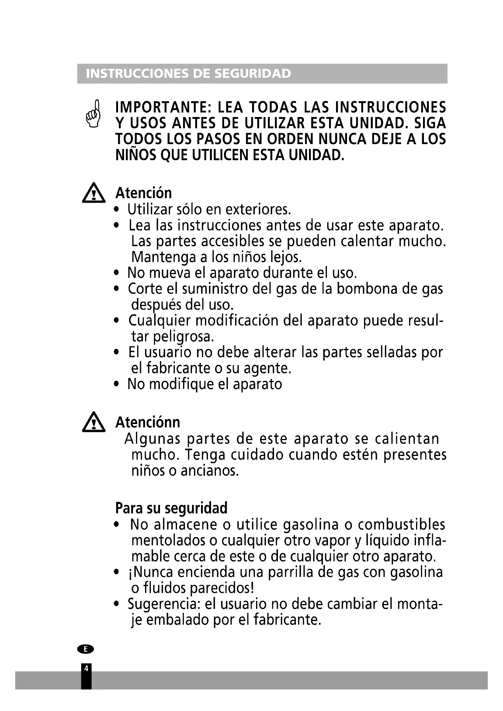 - Lea las instrucciones antes de utilizar la parrilla de gas.