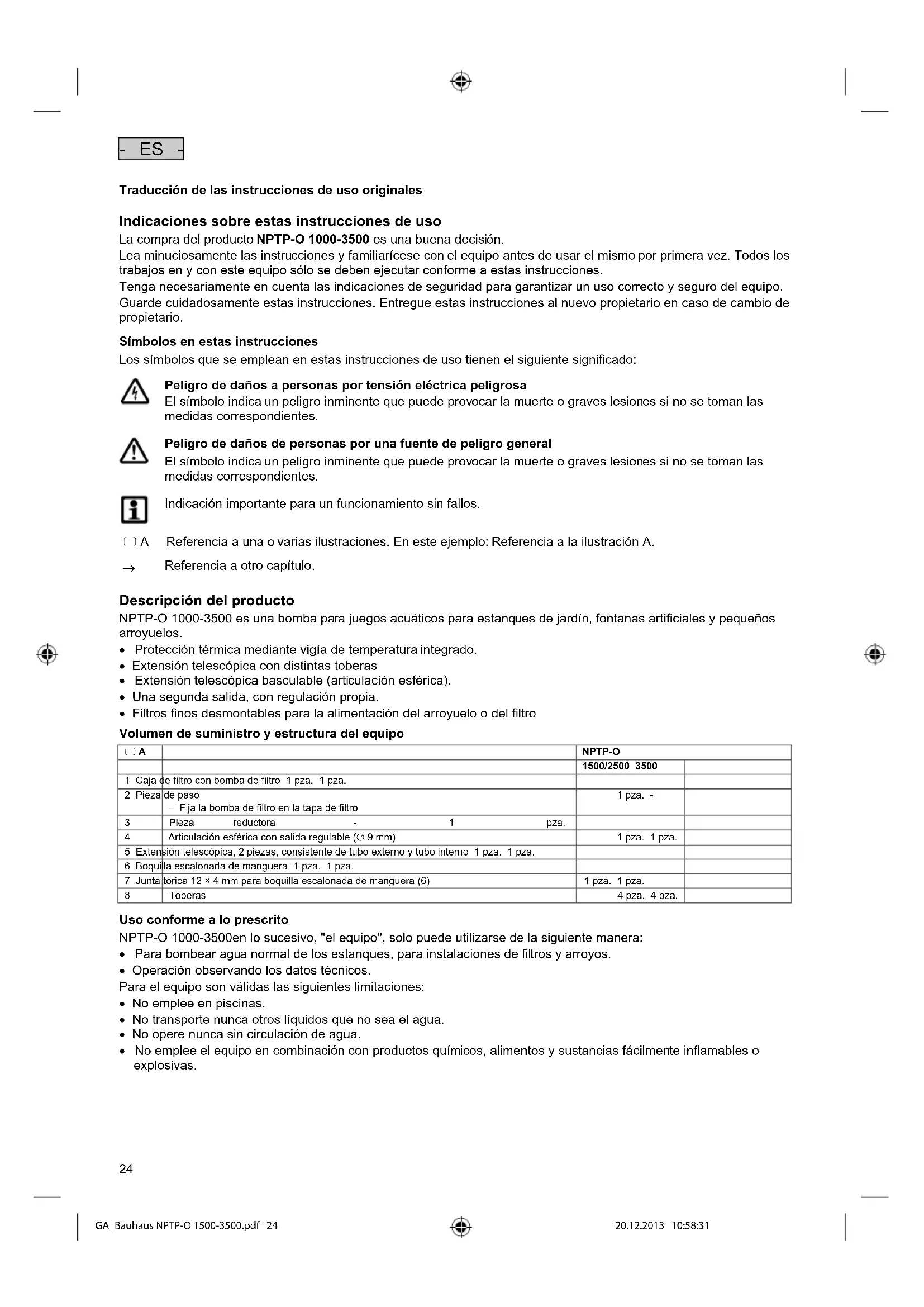 GA_Bauhaus NPTP-O 1500-3500.pdf 23 20.12.2013 10:58:3124 - ES - Traducción de las instrucciones de uso originales Indicaciones sobre estas instrucciones de uso La compra del producto NPTP-O 1000-3500 es una buena decisión. Lea minuciosamente las instrucciones y familiarícese con el equipo antes de usar el mismo por primera vez. Todos los trabajos en y con este equipo sólo se deben ejecutar conforme a estas instrucciones. Tenga necesariamente en cuenta las indicaciones de seguridad para garantizar un uso correcto y seguro del equipo. Guarde cuidadosamente estas instrucciones. Entregue estas instrucciones al nuevo propietario en caso de cambio de propietario. Símbolos en estas instrucciones Los símbolos que se emplean en estas instrucciones de uso tienen el siguiente significado: