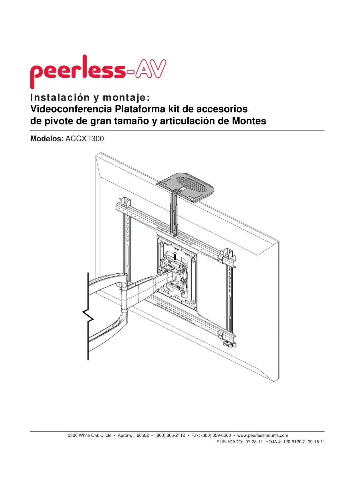 EPUBLICADO: 07-28-11 HOJA #: 120-9120-2 09-15-11 2300 White Oak Circle • Aurora, Il 60502 • (800) 865-2112 • Fax: (800) 359-6500 • www.peerlessmounts.com Modelos: ACCXT300 Instalación y montaje: Videoconferencia Plataforma kit de accesorios de pivote de gran tamaño y articulación de Montes7 de 17 PUBLICADO: 07-28-11 HOJA #: 120-9120-2 09-15-11 Español