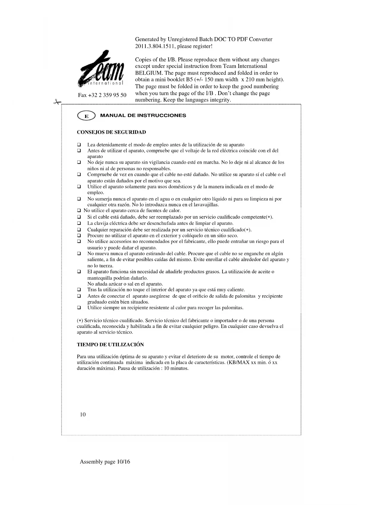 Para una utilización optima de su aparato y evitar el deterrioro de su motor, controle el tiempo de uso,继续保持 continua maxima indicada en la place de caracteristicas. (KB/MAX xx min. 0 xx duración maxima). Pausa de uso: 10 horas.