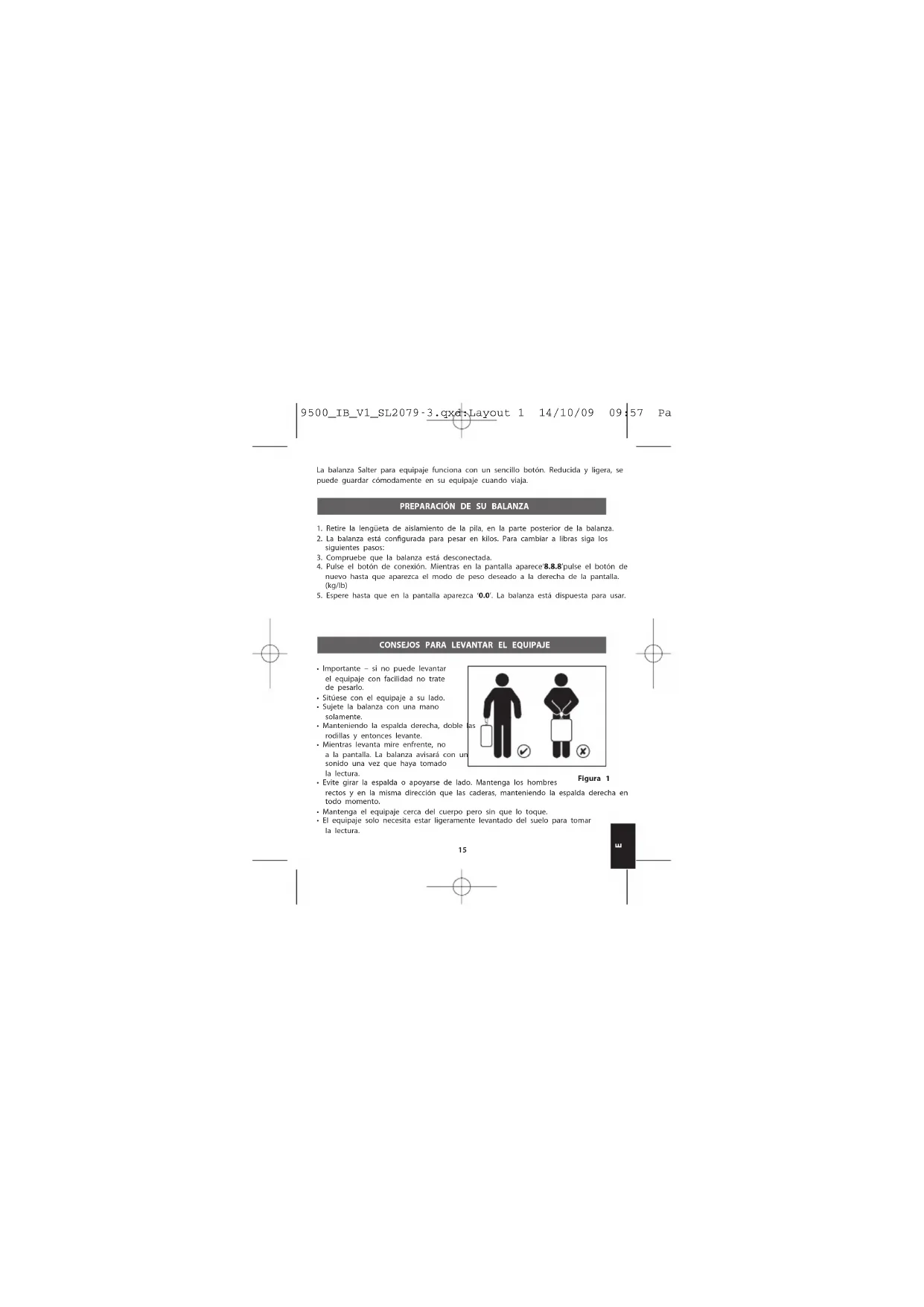 - Una vez tomada la lectura, baje el equipaje en orden reverso a cuando lo levantó. (Figura 1 muestra el método correcto de levantar) 9500_IB_V1_SL2079-3.qxd:Layout 1 14/10/09 09:57 Page 1617
