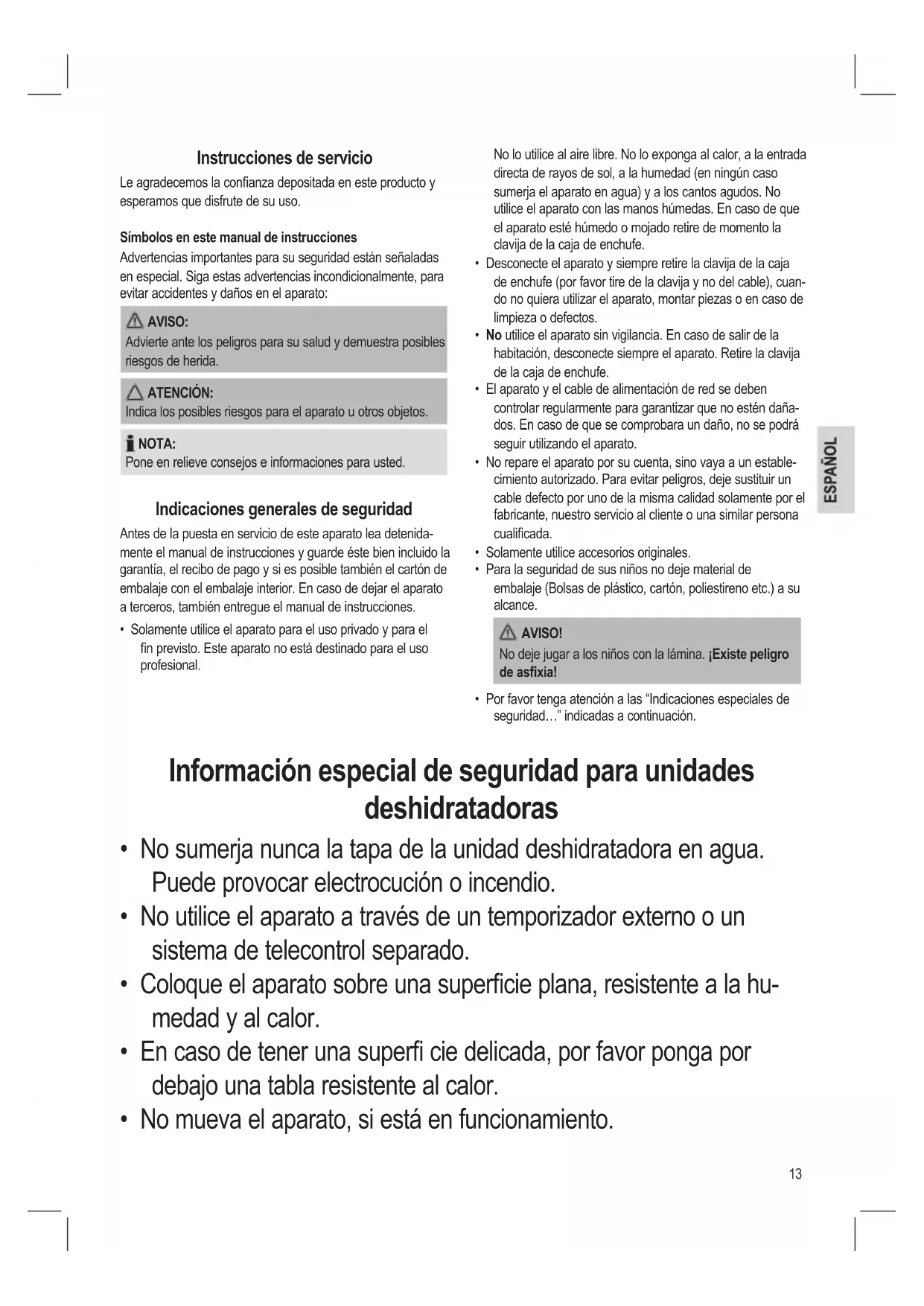 - Por favor tenga atención a las “Indicaciones especiales de seguridad…” indicadas a continuación. Información especial de seguridad para unidades deshidratadoras